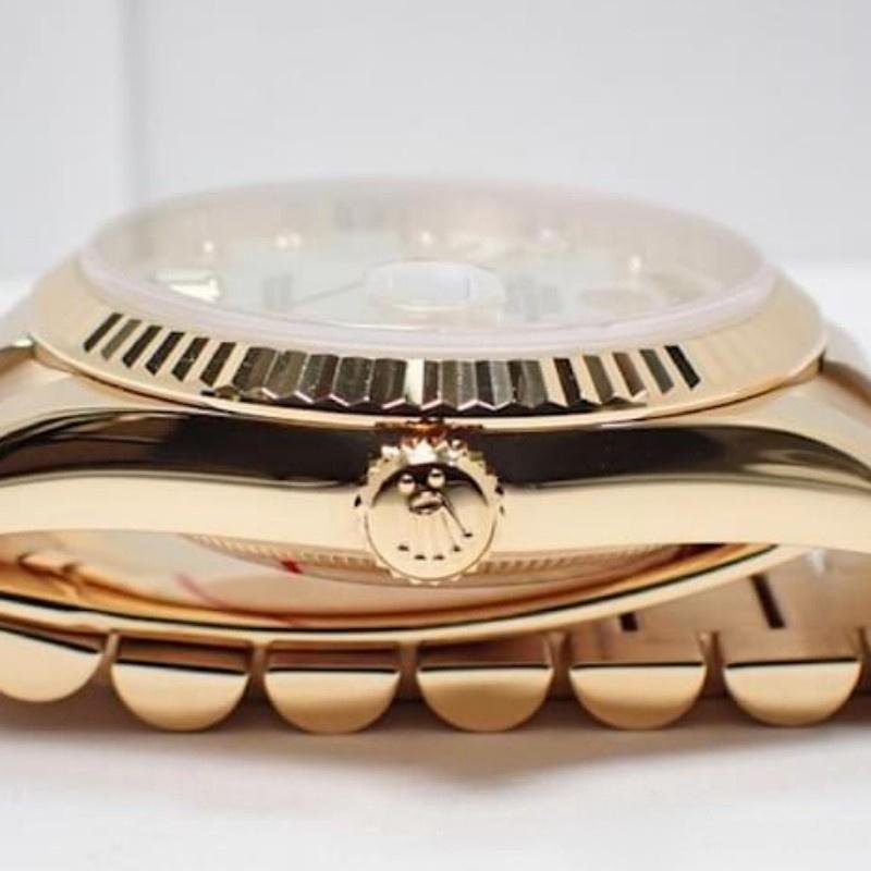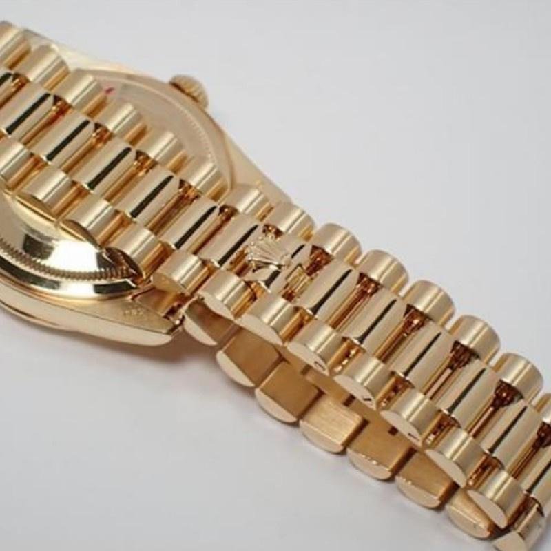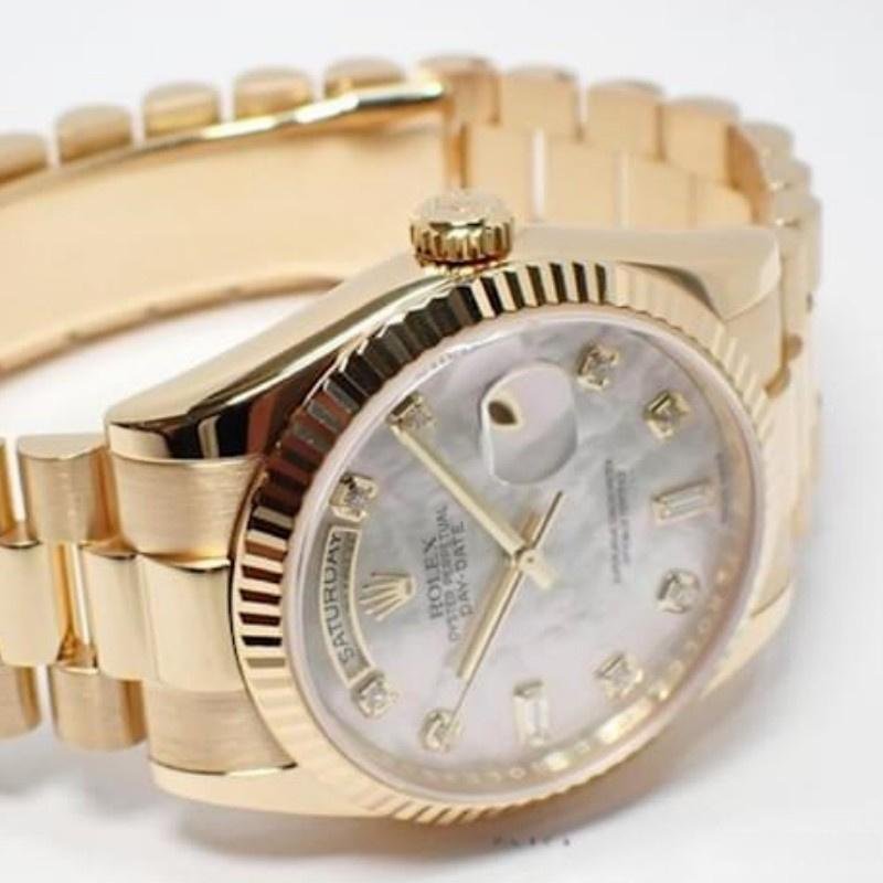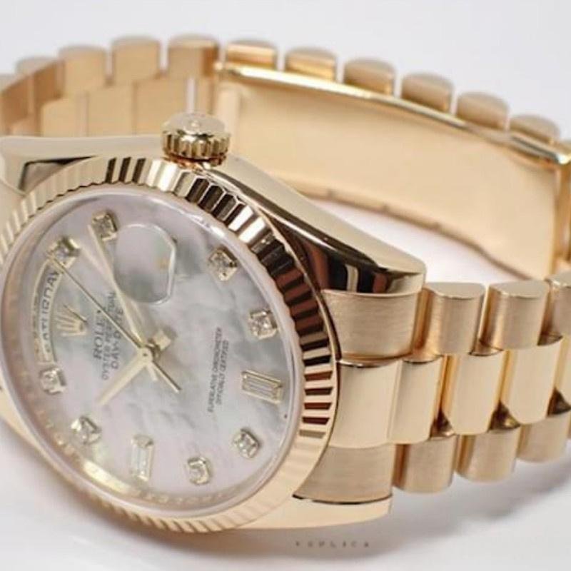 The Rolex Day-Date 118238, unisex replica with 36mm mother-of-pearl white dial, features a 36mm round yellow gold case with screw-down crown and fluted yellow gold bezel. White mother-of-pearl dial set with diamonds, manufacturer serial numbers and day and date indicator at 12 and 3. Scratch resistant sapphire crystal. Screw-down crown. The reliable yellow gold Oyster bracelet will look great on your wrist.