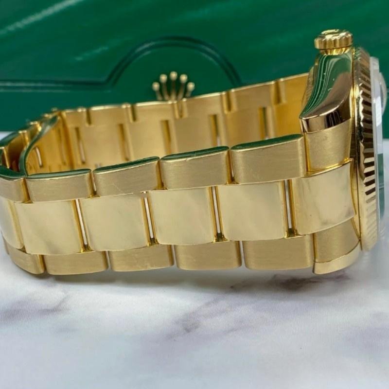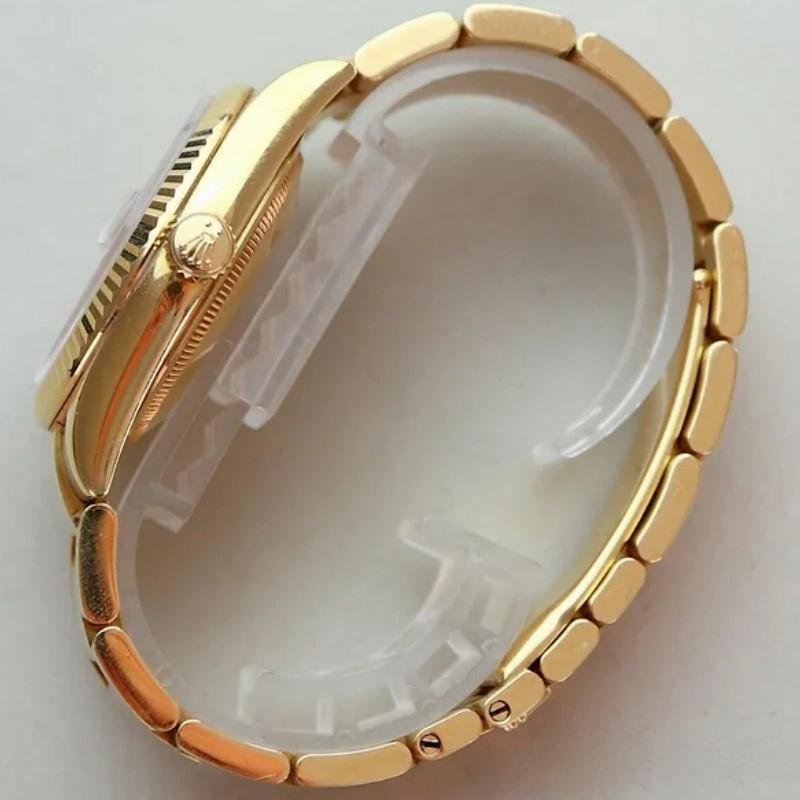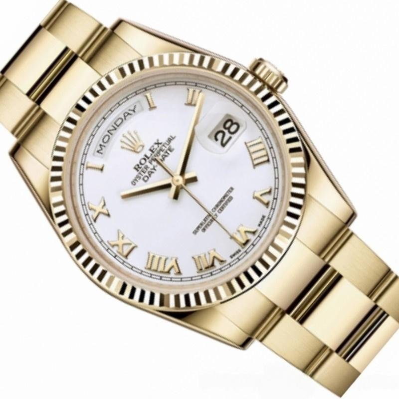 The Rolex Day-Date 118238, 36mm unisex replica with white dial and Roman numerals, it features a 36mm round yellow gold case, screw-down crown and fluted yellow gold bezel. With a white dial with Roman numerals that houses an external Cyclops date window at 3 and a day window between 11 and 1, shoulders and sides of the case with a polished finish. Solid caseback. The reliable yellow gold Oyster bracelet will look great on your wrist.