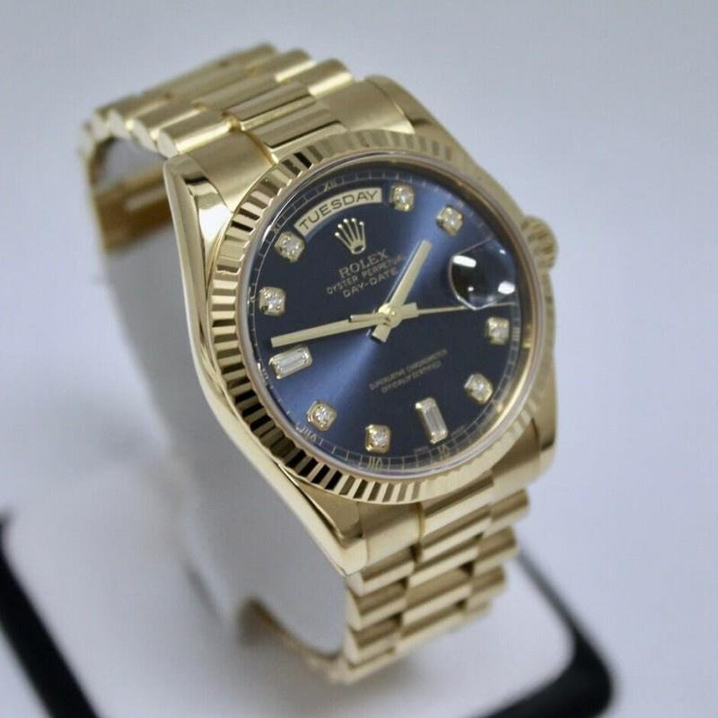 The Rolex Day-Date 118238, unisex replica with blue diamond dial, it features a 36mm round yellow gold case with screw-down crown and fluted yellow gold bezel. Blue dial with diamonds set, quarter-hour indexes with baguette-cut diamonds, exterior Roman numerals on the minutes/second scale, windows for days of the week and date in English. Yellow gold cane needles. The reliable yellow gold Oyster bracelet will look great on your wrist.