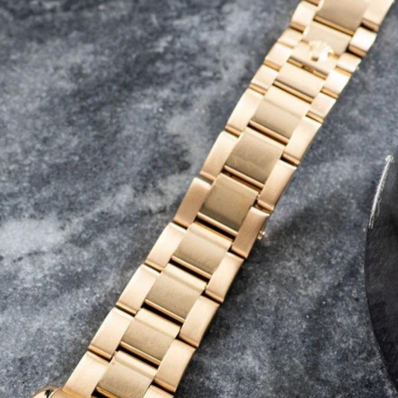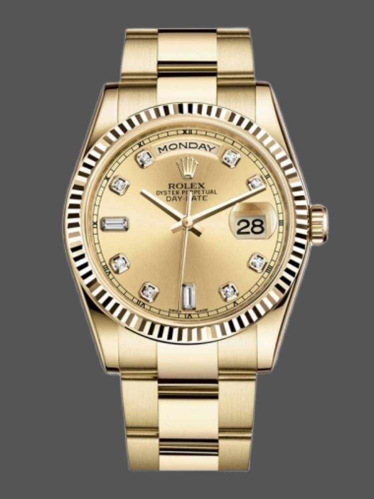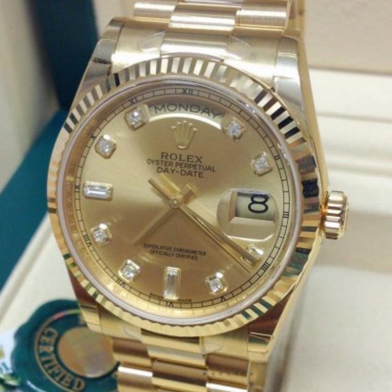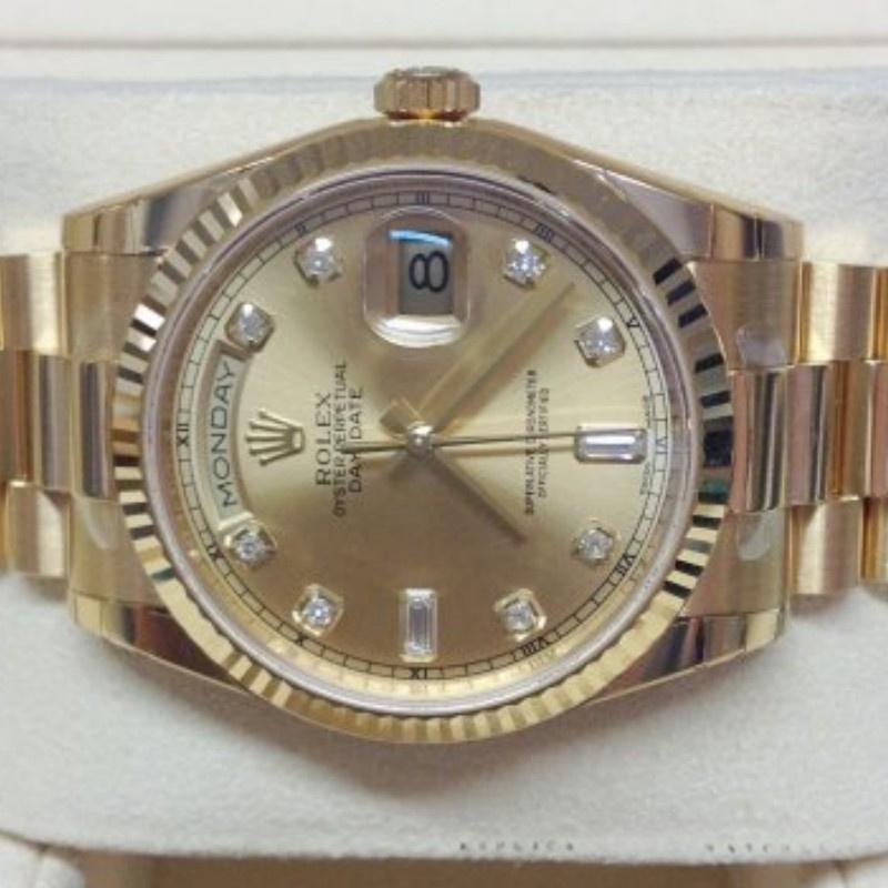 The Rolex Day-Date 118238, champagne diamond dial, 36 mm, unisex replica, it features a 36mm round yellow gold case with screw-down crown and fluted yellow gold bezel. Featuring a champagne-colored dial with diamond dots that houses an external Cyclops date window at 3 and a day window between 11 and 1, surrounded by a fluted yellow gold bezel, the reliable yellow gold Oyster bracelet will look great on your wrist.