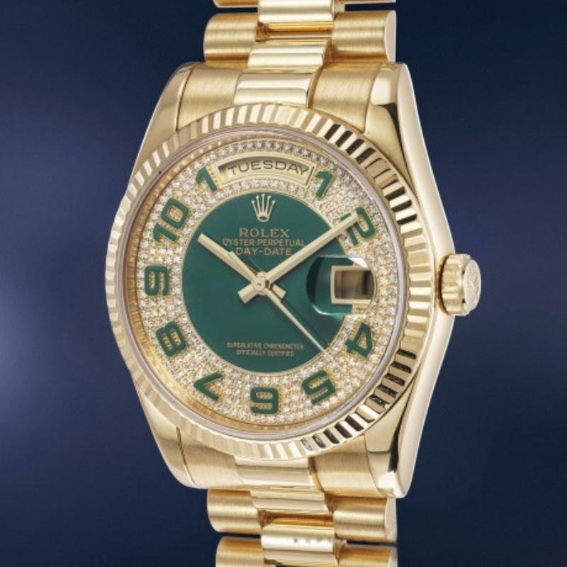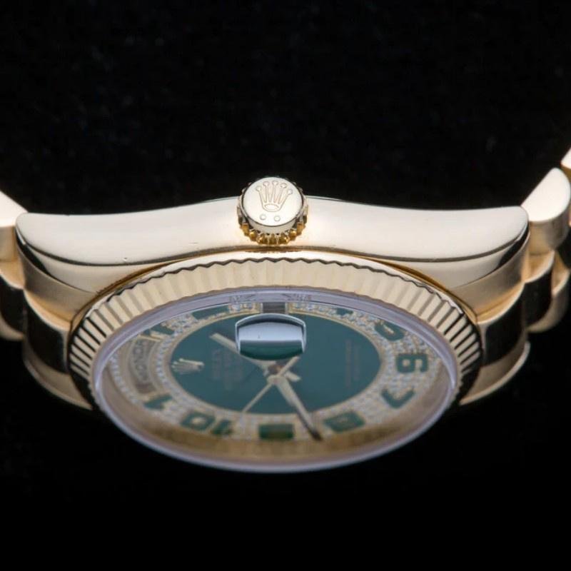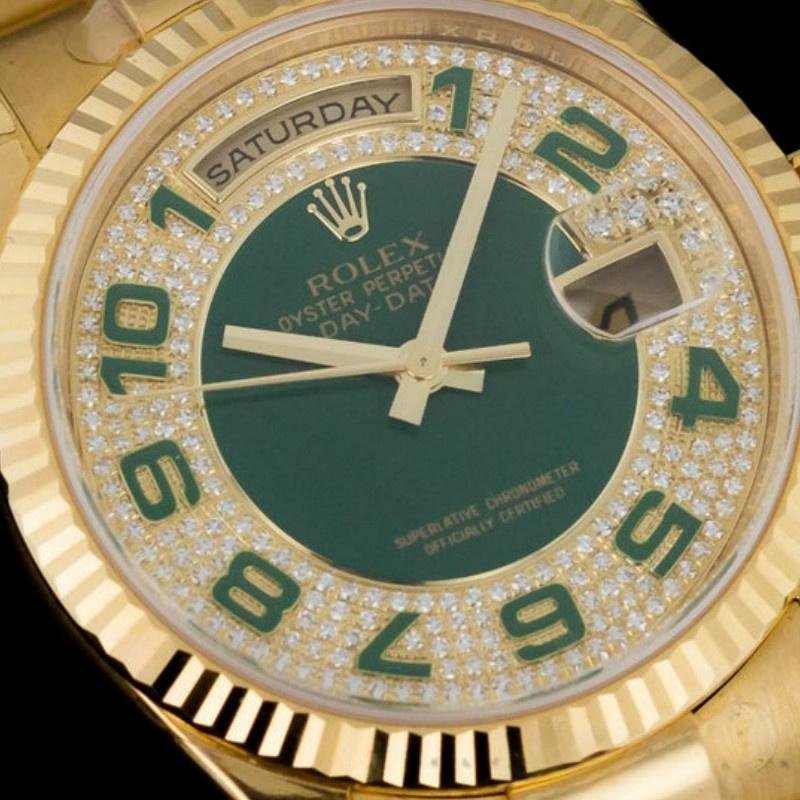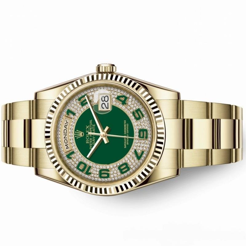 The Rolex Day-Date 118238, green diamond pav?? dial, 36mm unisex watch, it features a 36mm round yellow gold case with screw-down crown and fluted yellow gold bezel. Green dial with original diamond pav?? set on the outer dial, green enameled Arabic numerals and day and date indicator at 12 and 3. Scratch resistant sapphire crystal. Screw-down crown. The reliable yellow gold Oyster bracelet will look great on your wrist.