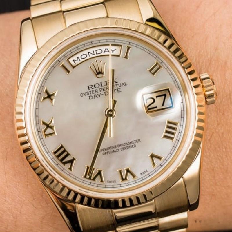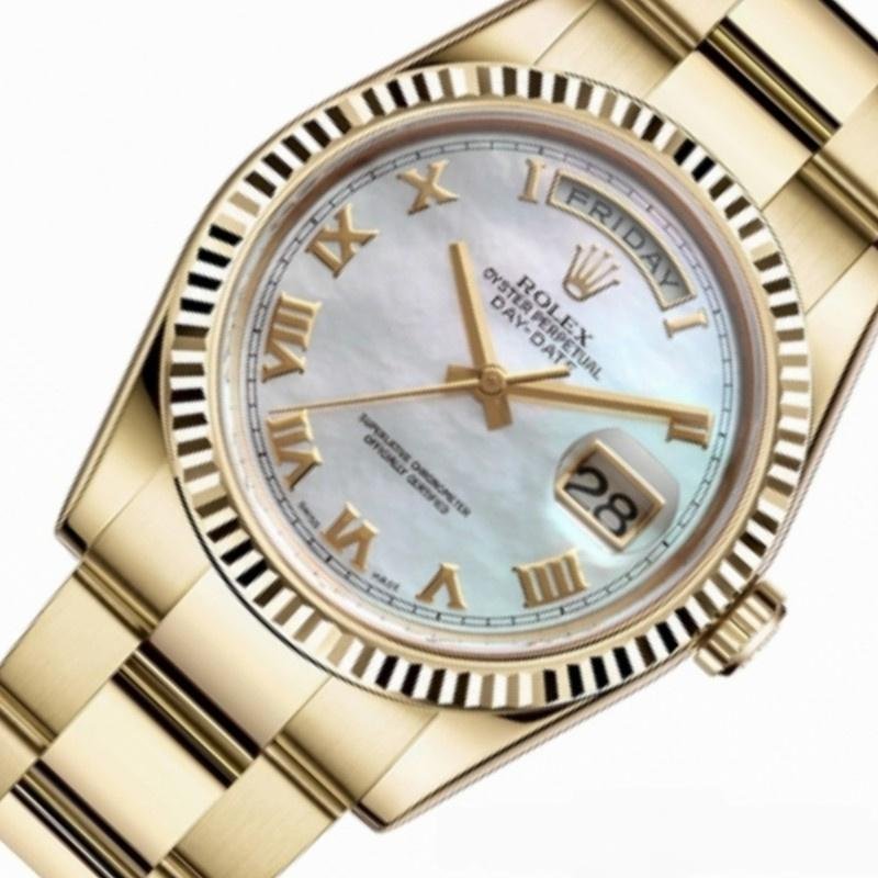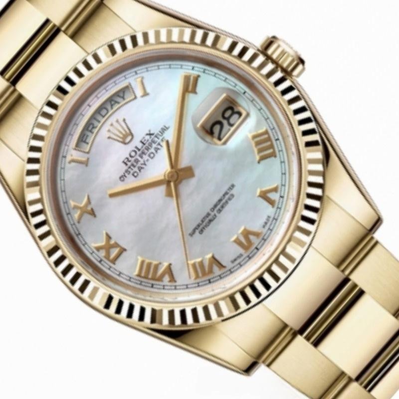 The Rolex Day-Date 118238, 36mm unisex replica with white mother-of-pearl Roman dial, 36mm yellow gold round case, screw-down crown and yellow gold fluted bezel. It features an attractive white mother-of-pearl dial with Roman markers. Day and date display at 12 and 3. Scratch resistant sapphire crystal. Screw-down crown. The reliable yellow gold Oyster bracelet will look great on your wrist.
