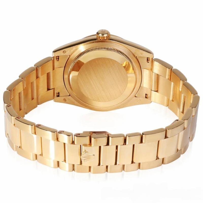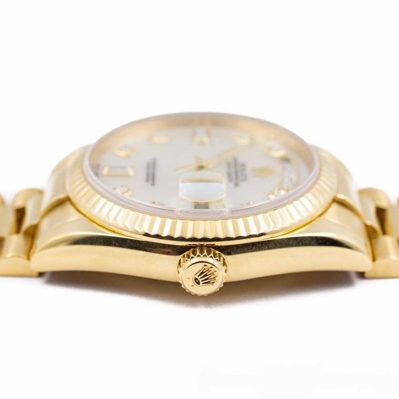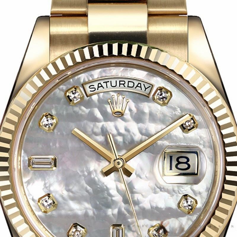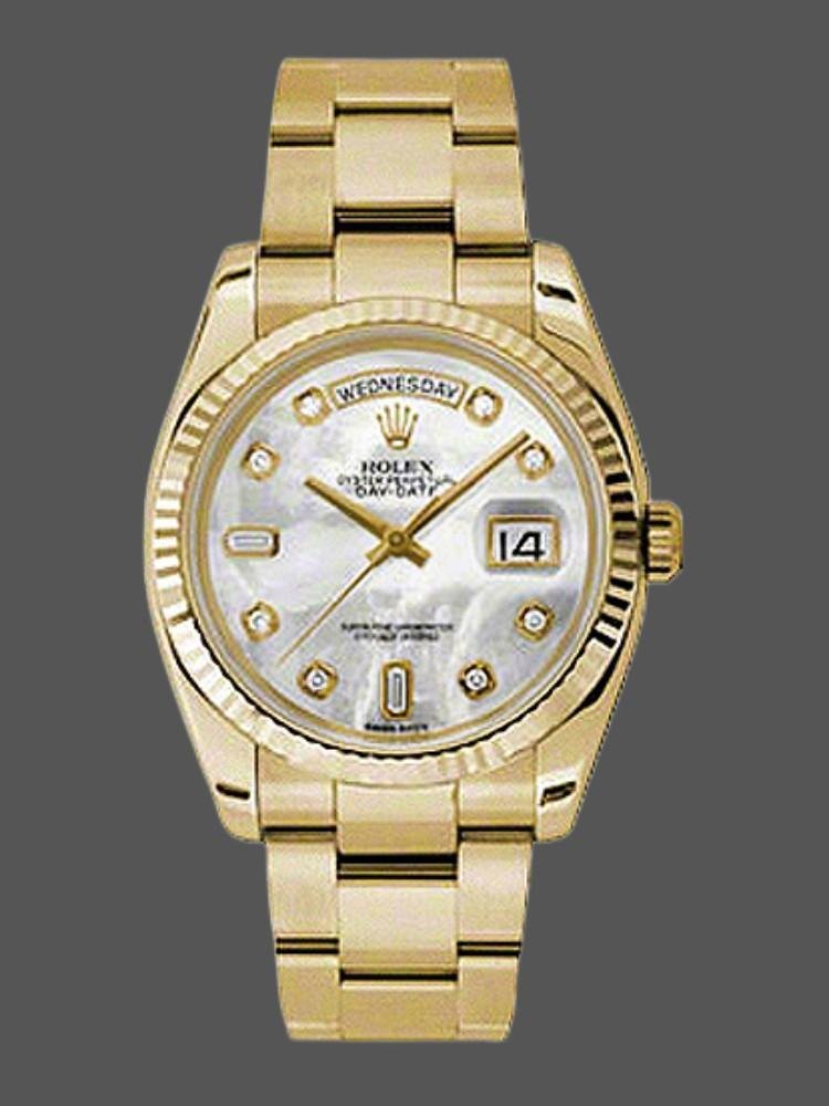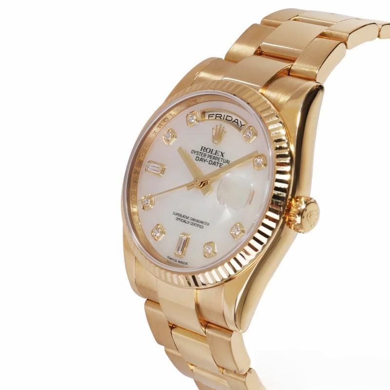The Rolex Day-Date 118238 MOP, white dial, 36 mm, unisex replica, it features a 36mm round yellow gold case with screw-down crown and fluted yellow gold bezel. White mother-of-pearl dial set with diamonds. Manufacturer serial numbers and day and date indicator at 12 and 3. Scratch resistant sapphire crystal. Screw-down crown. The reliable yellow gold Oyster bracelet will look great on your wrist.