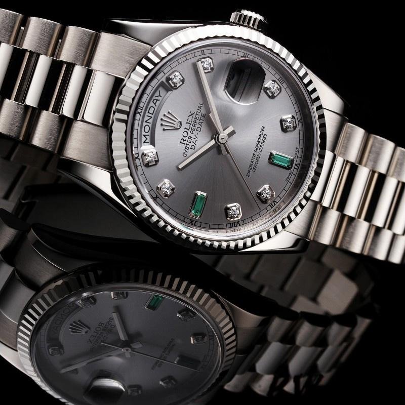 Unisex Rolex Day-Date 118239 replica watch, rhodium gray dial, 36 mm. 36mm white gold case with white gold Rolex Oyster bracelet. White gold ribbed fixed bezel. Rhodium-plated gray dial with a fun sunray effect finish. 8 round diamonds and 2 baguette-cut emerald hour markers. Polished white gold hands. Day of the week window at 12. Date window at 3 o’clock with cyclops magnifying glass. Scratch resistant sapphire crystal. Screw-down crown.