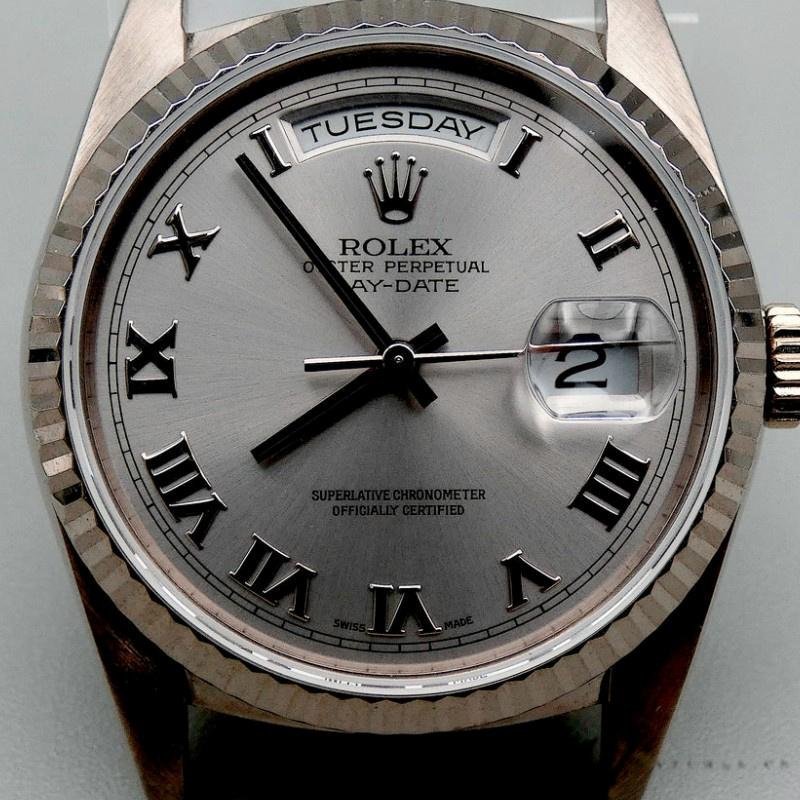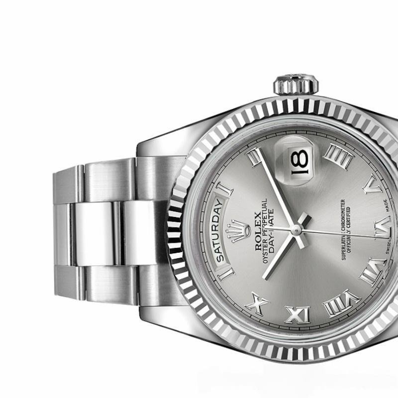 Rolex Day-Date 118239 unisex replica watch with 36 mm rhodium-plated Roman dial. 36mm white gold case with white gold Rolex Oyster bracelet. White gold ribbed fixed bezel. Gray rhodium-plated dial with Roman numerals. Day of the week window at 12. Date window at 3 o’clock with cyclops magnifying glass. Scratch resistant sapphire crystal. Screw-down crown.