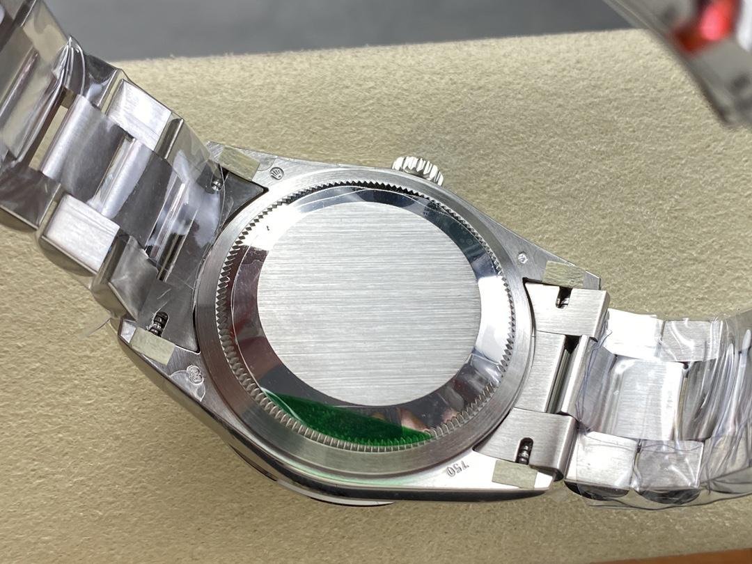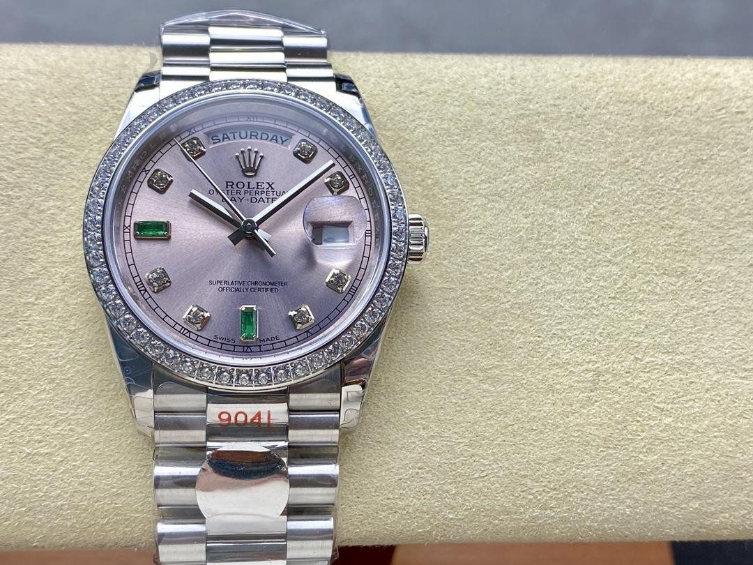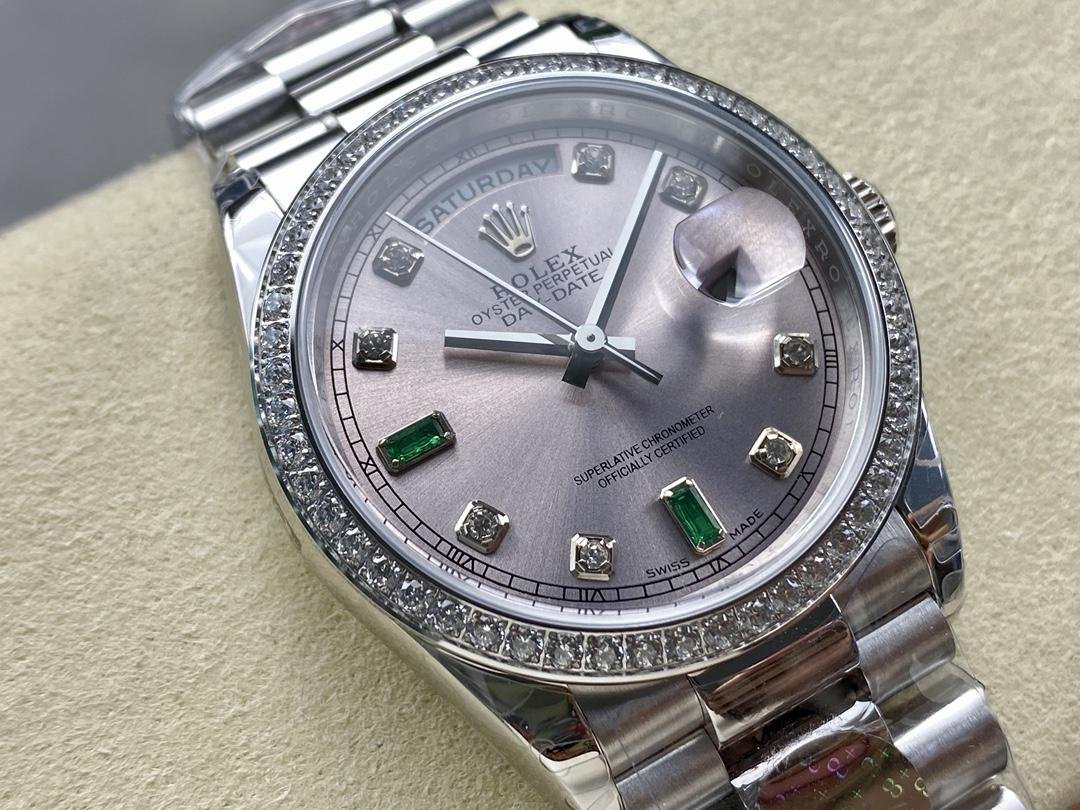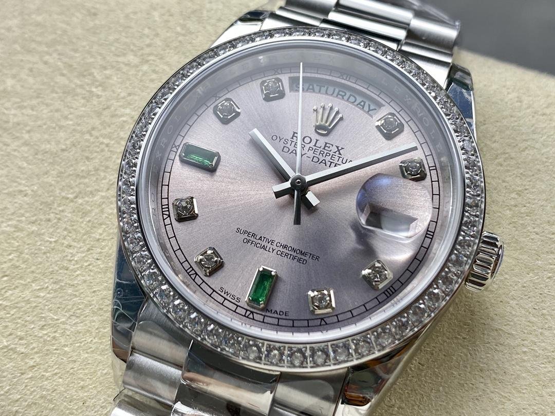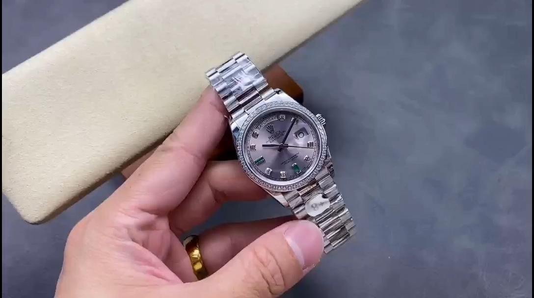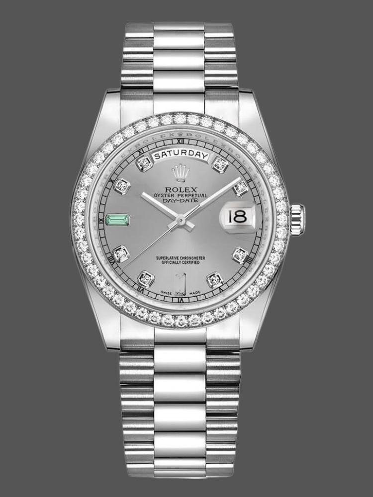 Rolex Day Date 118346 unisex replica watch, rhodium-plated gray dial, 36 mm. 36mm polished platinum case with rhodium dial (light gray) with a fun sunray effect finish. 8 round diamonds and 2 baguette-cut hour markers with emerald. The dial is surrounded by a bezel set with round brilliant-cut diamonds. Day of the week window at 12. Date window at 3 o’clock with cyclops magnifying glass. The elegant platinum design with hidden folding crown closure will look perfect on your wrist.