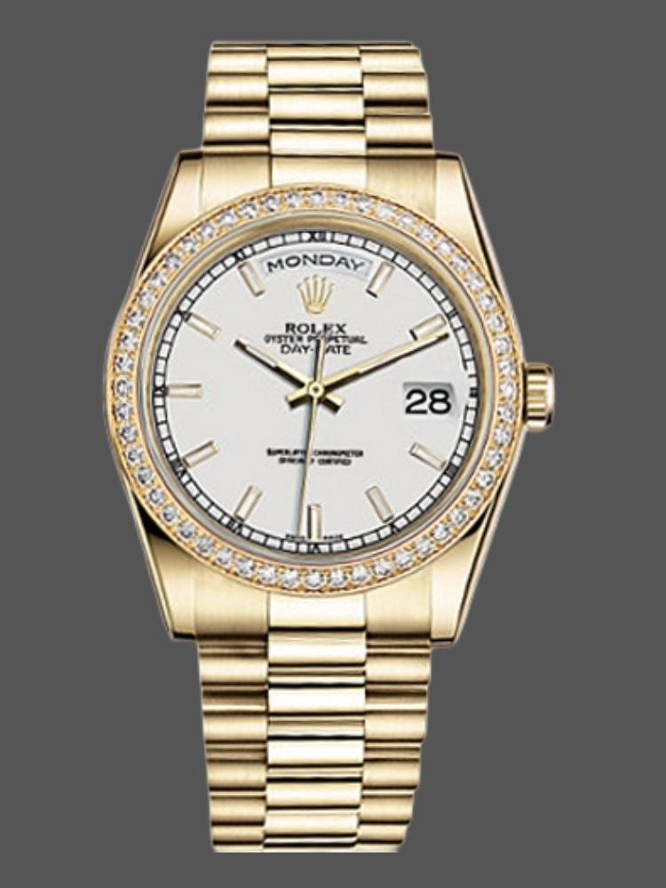Rolex Day-Date 118348 – Unisex yellow gold replica, white dial, 36 mm. Round 36mm yellow gold case with screw-down crown and diamond bezel. White dial. Day of the week window at 12. Date window at 3 o’clock with cyclops magnifying glass. The dial is surrounded by a round bezel set with brilliant-cut diamonds. Its elegant design with hidden folding crown closure will give a touch of class to your wrist.