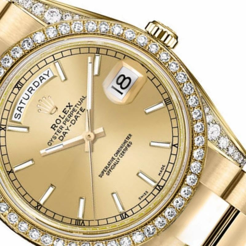 Replica of the unisex Rolex Day-Date 118388 watch with a 36 mm champagne-colored index dial