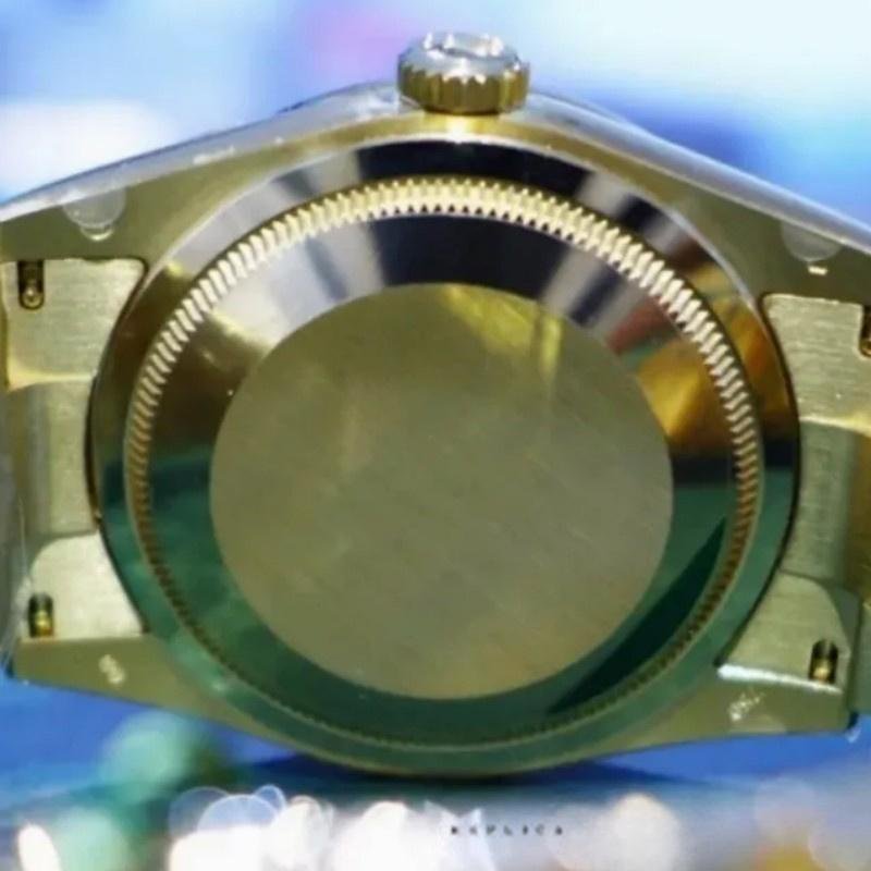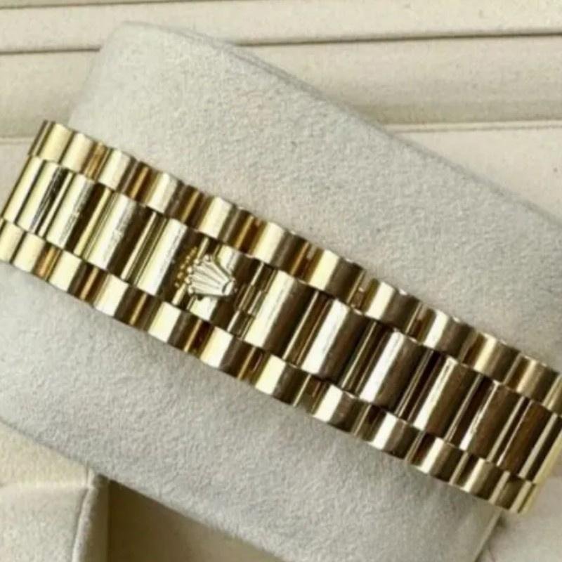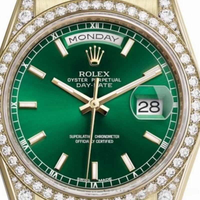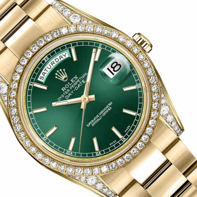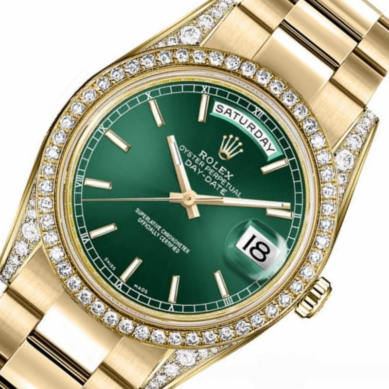 The Rolex Day-Date 118388, unisex yellow gold replica with green dial and indexes, 36 mm, features a 36mm yellow gold case set with diamonds, green dial indexes, diamond-encrusted handles, matching diamond bezel, hour and minute hands, and scratch-resistant sapphire crystal with Cyclops magnifying glass. Day of the week window at 12. Date window at 3. Its elegant design with hidden folding crown closure will give a touch of class to your wrist.