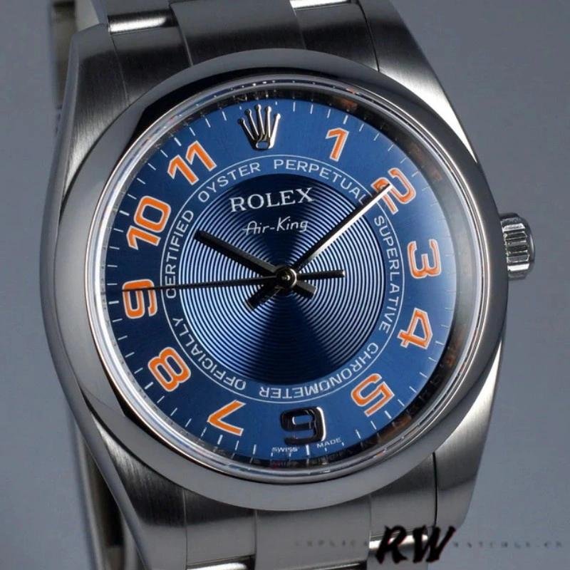 Rolex Oyster Perpetual Air-King 114200 unisex replica watch with 34mm concentric blue dial. 34 mm diameter stainless steel case. Smooth and fixed domed stainless steel bezel. Concentric blue dial with pink Arabic numerals. Minute markers around the outer edge. Scratch resistant sapphire crystal. Screw-down crown. Solid caseback. Stainless steel Oyster bracelet with folding clasp.