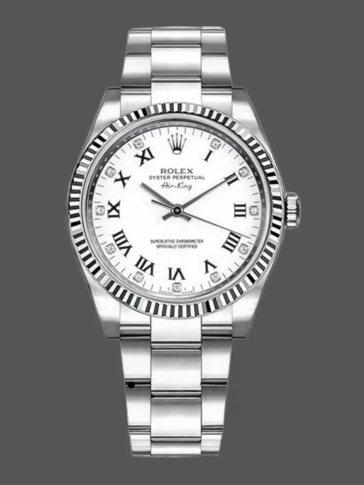 Rolex Oyster Perpetual Air-King 114234 unisex replica watch with white dial and 34 mm diamonds. 34 mm diameter stainless steel case. White dial with silver hands and hour indices with diamonds and Roman numerals. Minute trees on the outer edge. White gold fluted bezel. Scratch resistant sapphire crystal. Oyster stainless steel bracelet with Oysterlock closure. Compatible with 19.5 cm dolls.