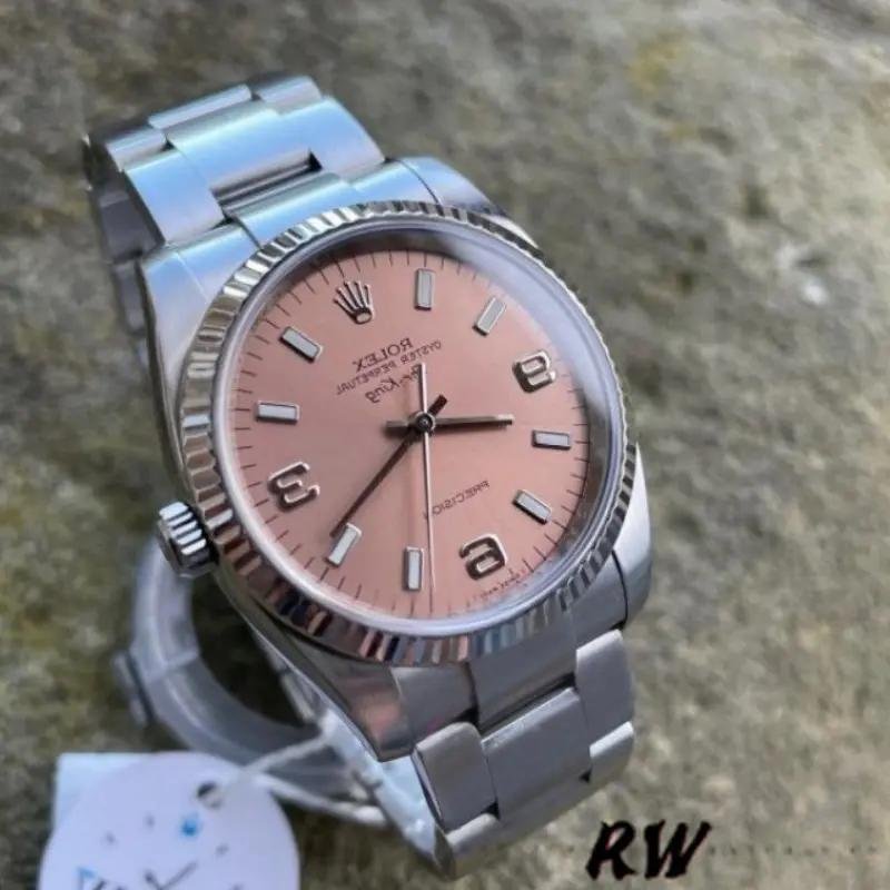 Rolex Oyster Perpetual Air-King 114234 unisex replica watch with 34 mm pink dial. 34mm stainless steel case and white gold fluted bezel. Scratch resistant sapphire crystal. Pink dial with Arabic numerals and indexes. Arabic numerals appear at 3, 6 and 9. Minute markers around the outer edge. Oyster stainless steel bracelet with Oysterlock clasp.