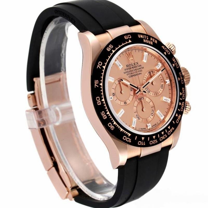 Rolex Cosmograph Daytona 116515LN Everose Gold Replica Watch with 40mm Pink Dial for Men. 40mm Everose gold case with black Oysterflex strap. Black ceramic bezel with fixed tachymeter scale. Pink dial with Everose gold hands and diamond indexes. Rose gold Flip Lock folding clasp rubber strap.