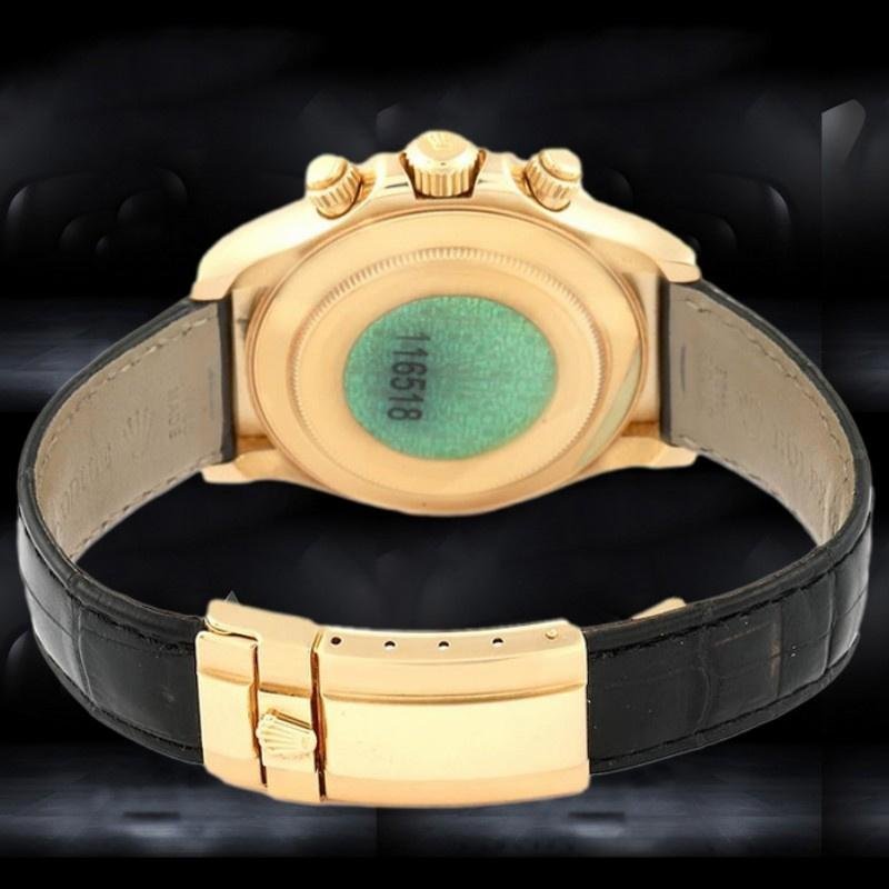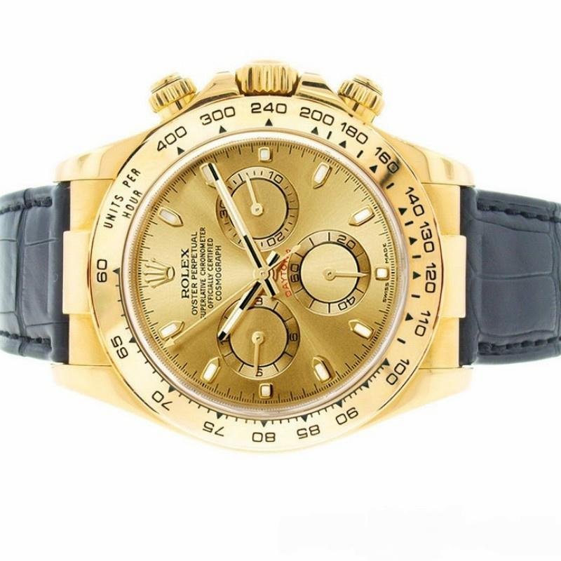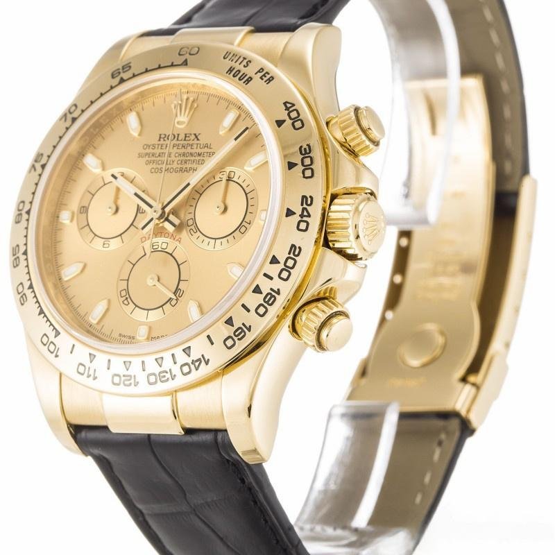 Rolex Cosmograph Daytona 116518 replica watch for men, champagne dial, 40mm yellow gold bezel. 40mm yellow gold case. Sapphire crystal. Champagne dial with luminous hour markers, fixed bezel with tachymeter engraved in yellow gold, black leather strap with folding buckle. The minute track around the outer edge of the glass is a design element that represents time.