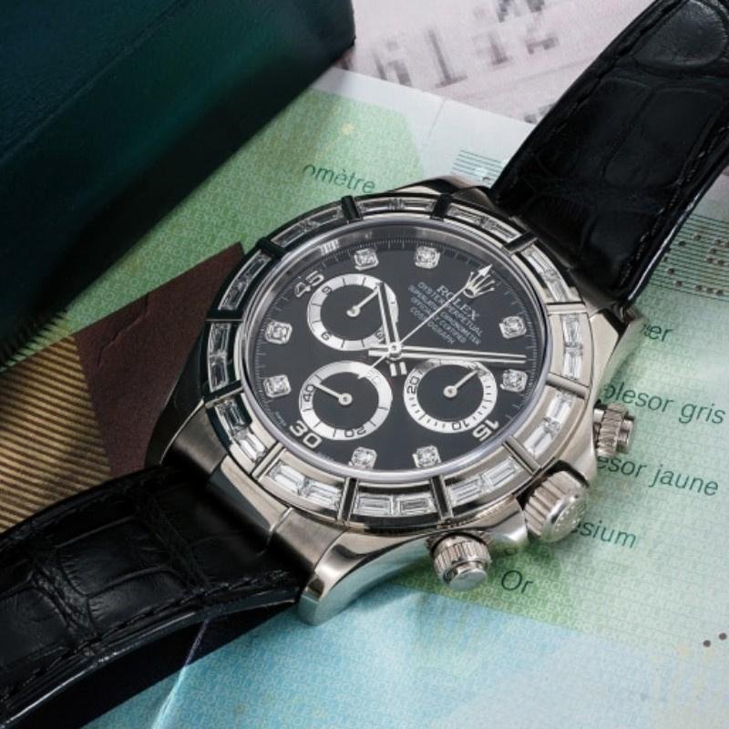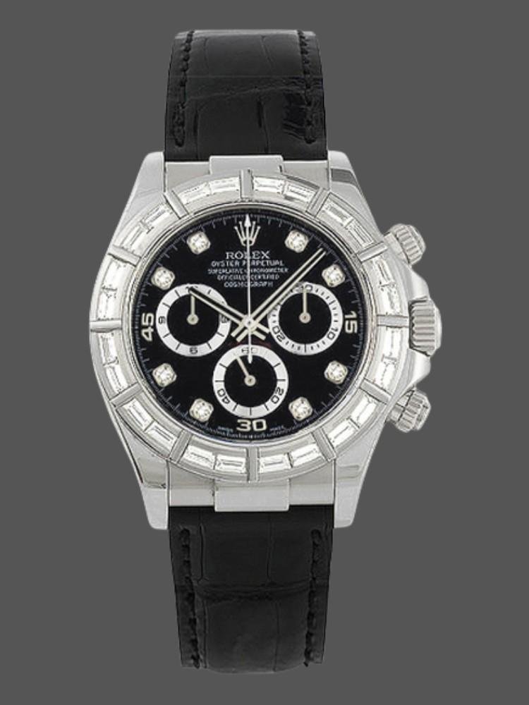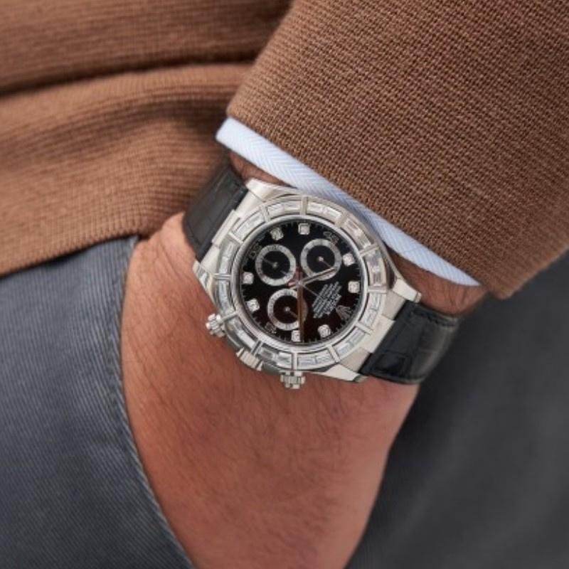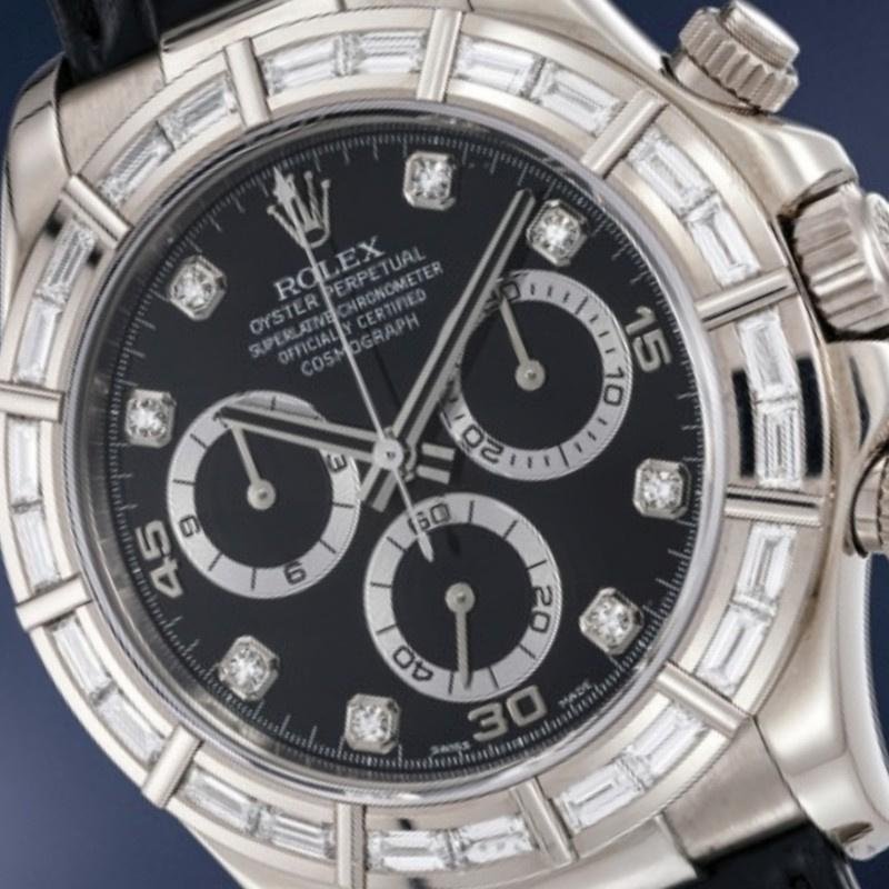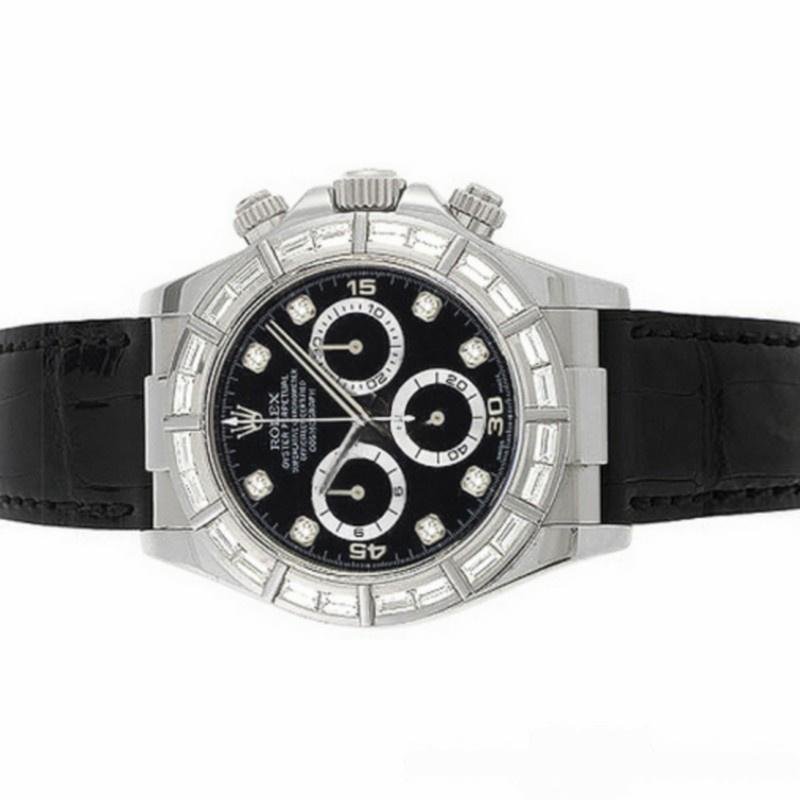 Rolex Cosmograph Daytona 116589, black dial with diamonds, 40 mm, diamond-set 40mm white gold bezel, scratch-resistant sapphire crystal. Black dial with diamond hour markers, 30-minute counter at 3 o’clock and 12-hour counter at 9 o’clock, black leather strap, screwed crown with Triplock triple sealing system.