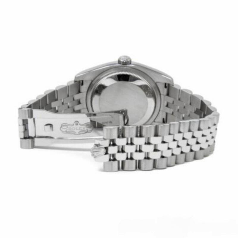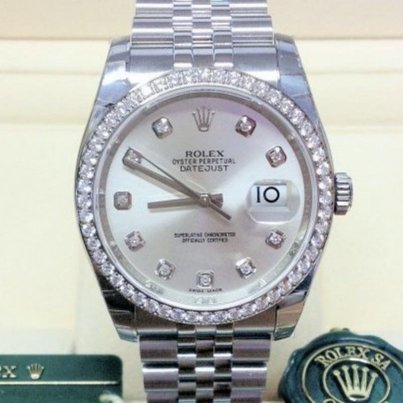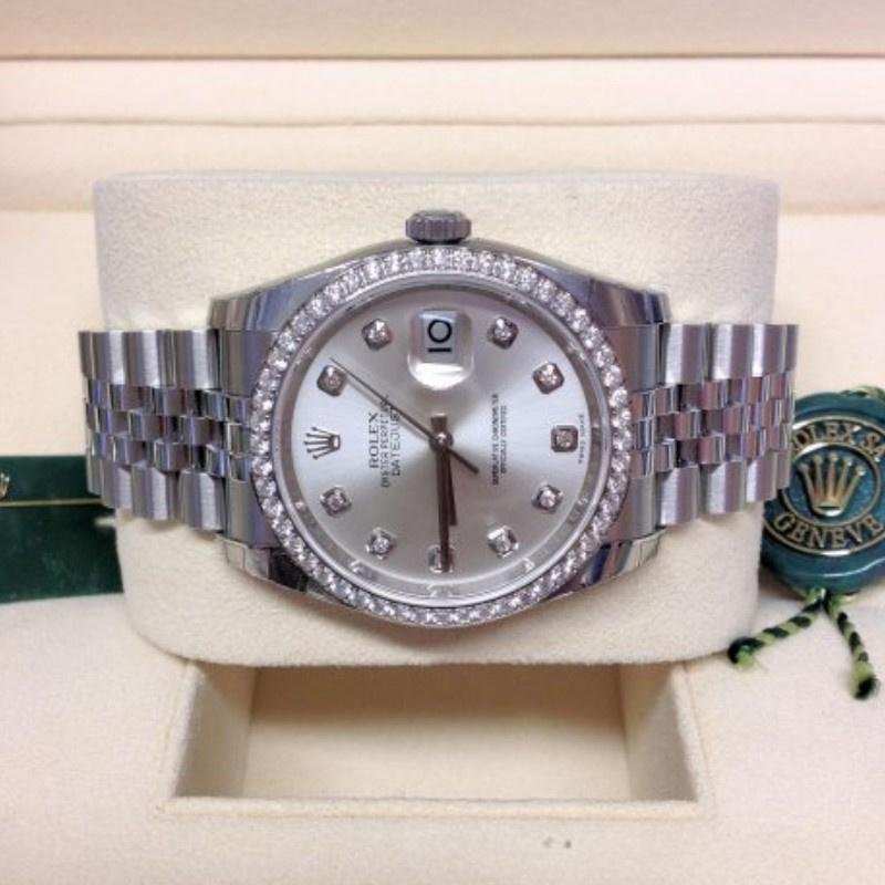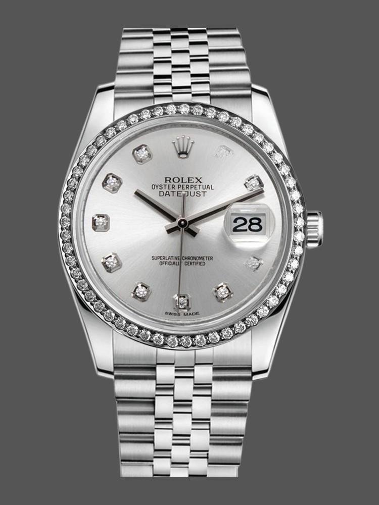 Rolex Datejust 116244 replica watch for women with silver dial and 36 mm diamonds. It features a silver dial with diamond dots. Date window at 3 o’clock with cyclops magnifying glass. 36mm polished stainless steel case and crown. Polished 18K white gold bezel with 52 diamonds set. Bracelet with outer and central links with brushed finish. Screwed crown and caseback. Hidden folding clasp.
