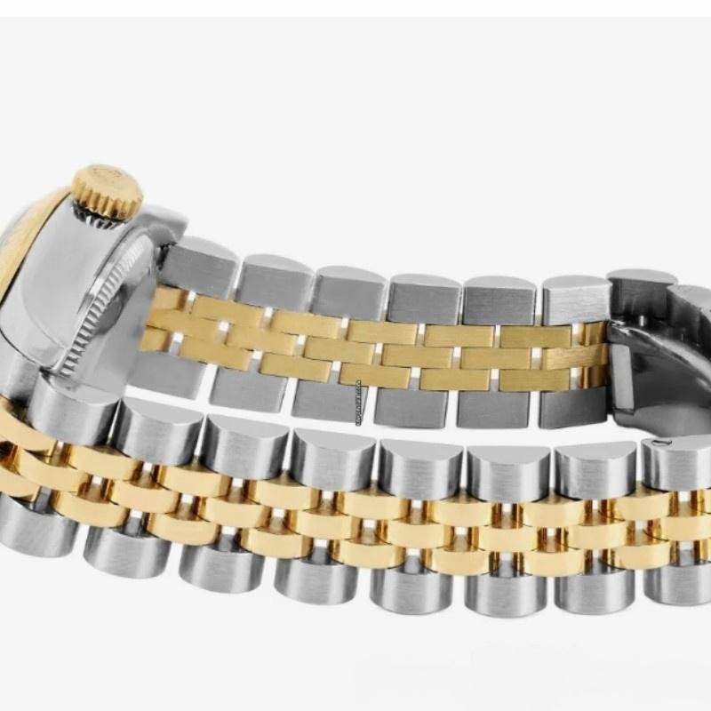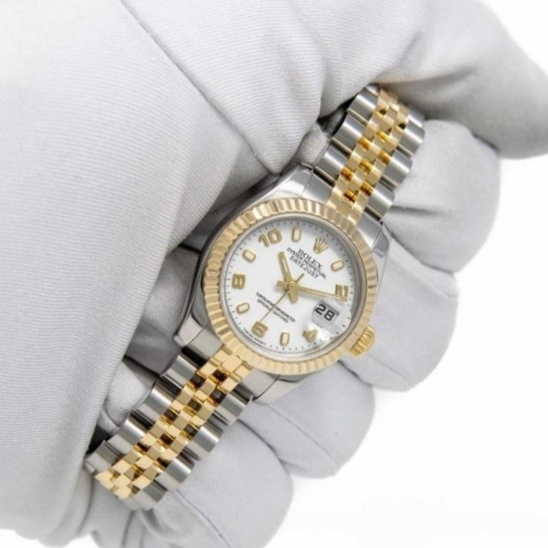 Rolex Datejust 179173 replica watch for women, white dial with Arabic numerals, fluted bezel, 26 mm. 26 mm diameter stainless steel Oyster case. Yellow gold fluted bezel. Scratch resistant sapphire crystal with Cyclops magnifying glass. White dial with hour markers in Arabic numerals. Calendar with window at 3. Jubilee stainless steel and yellow gold bracelet with hidden clasp.
