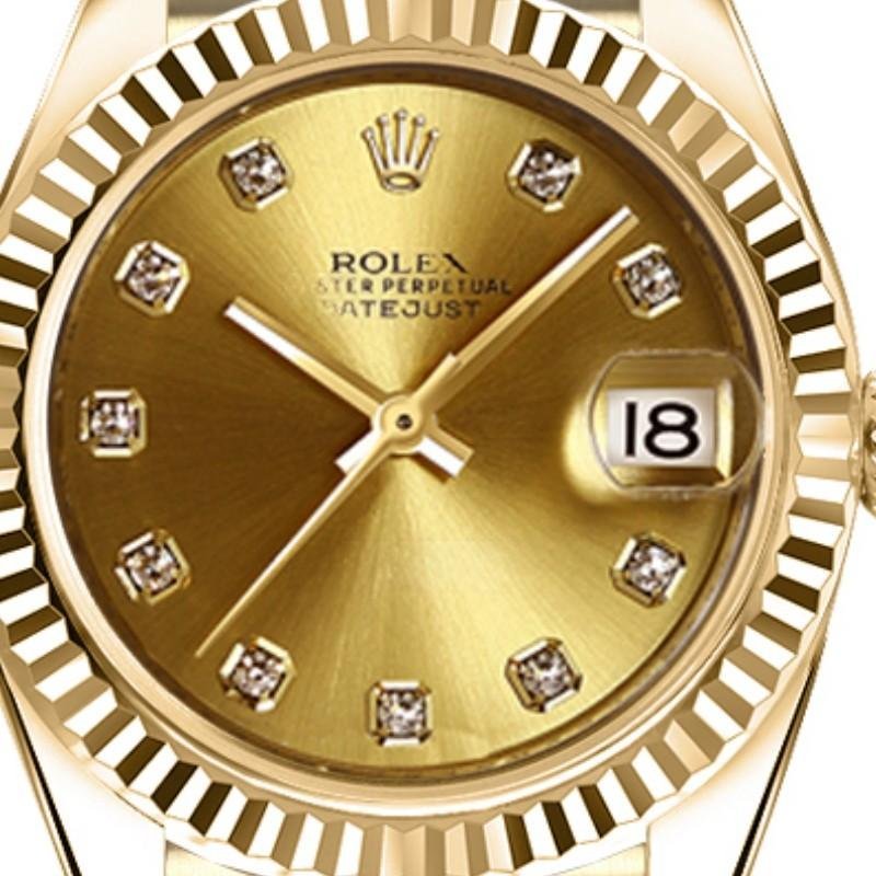 Rolex Datejust 179178 replica watch for women, champagne and diamond dial, yellow gold, 26 mm. 26mm diameter yellow gold Oyster case. Yellow gold fluted bezel. Scratch resistant sapphire crystal with Cyclops magnifying glass. Champagne dial with 10 diamond hour markers. Calendar with window at 3. Yellow gold President bracelet with hidden clasp.