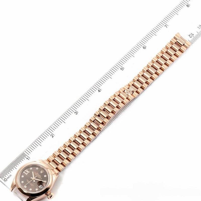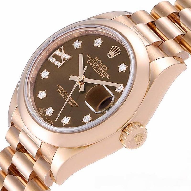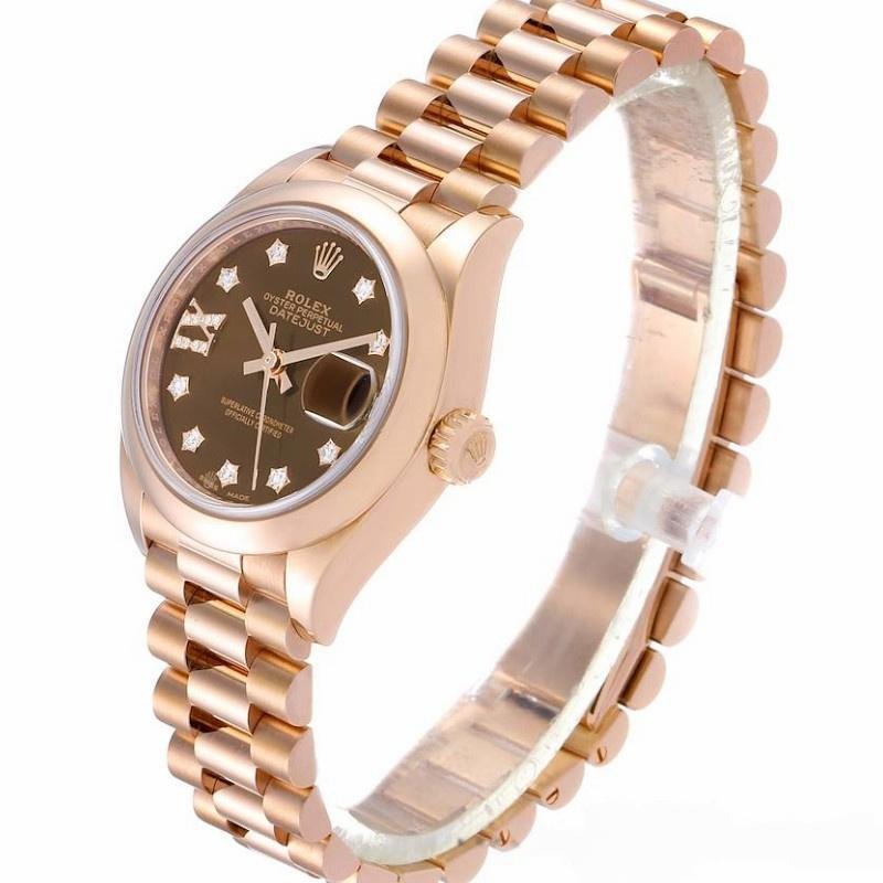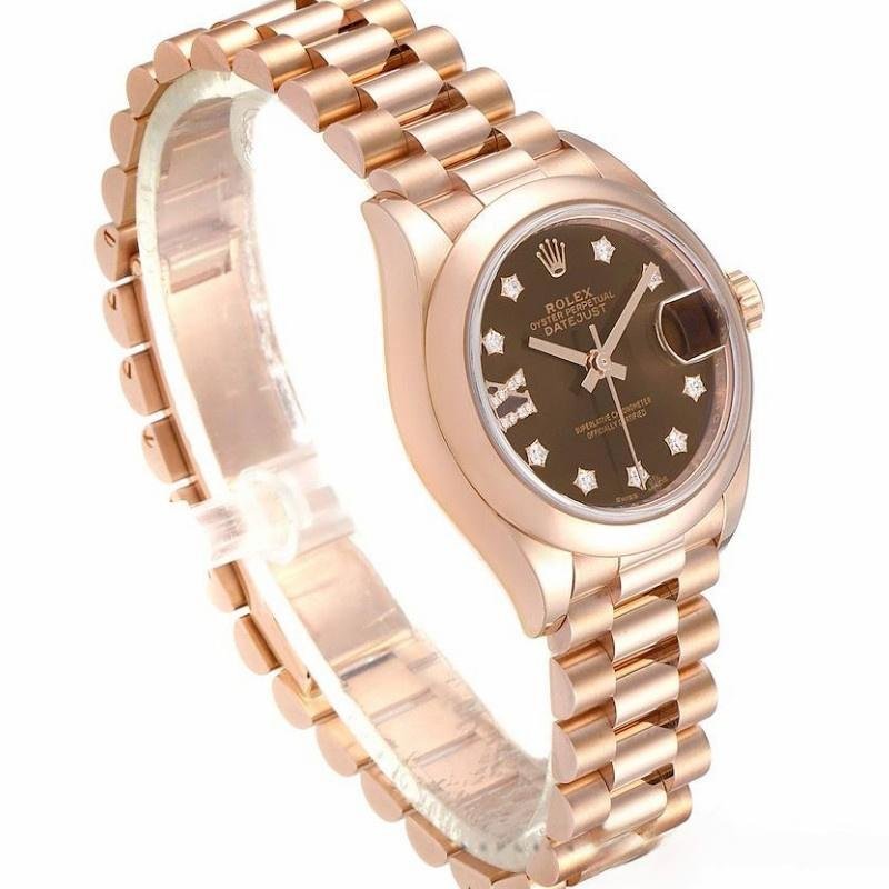 Rolex Datejust 279165 women’s watch, replica, 28 mm, chocolate brown dial with diamonds and domed bezel. 28mm Everose gold case and smooth domed bi-directional rotating bezel also in Everose gold. Scratch resistant sapphire crystal with Cyclops magnifying glass. Chocolate brown dial with 9 diamonds set in star settings on the hour markers and 8 diamonds set in Roman numeral IX. Calendar with window at 3. Rose gold presidential bracelet with hidden clasp.