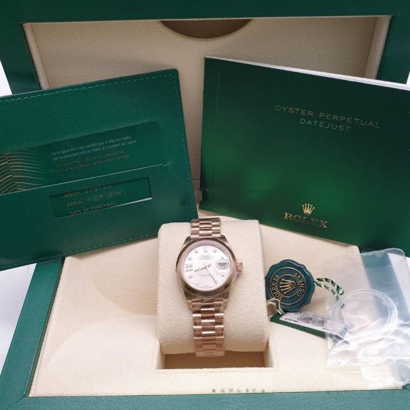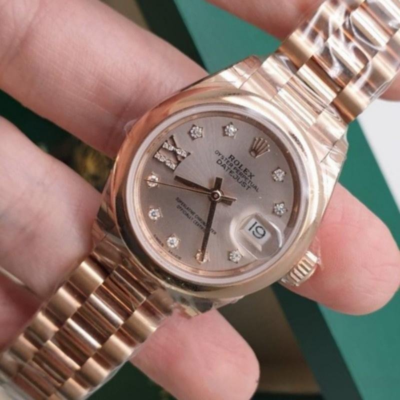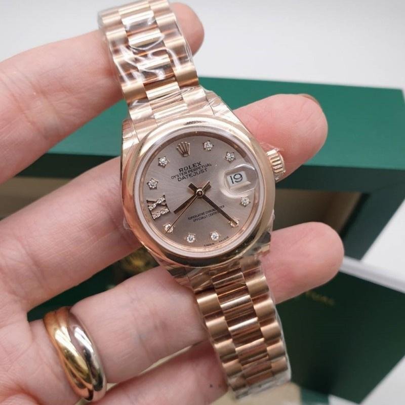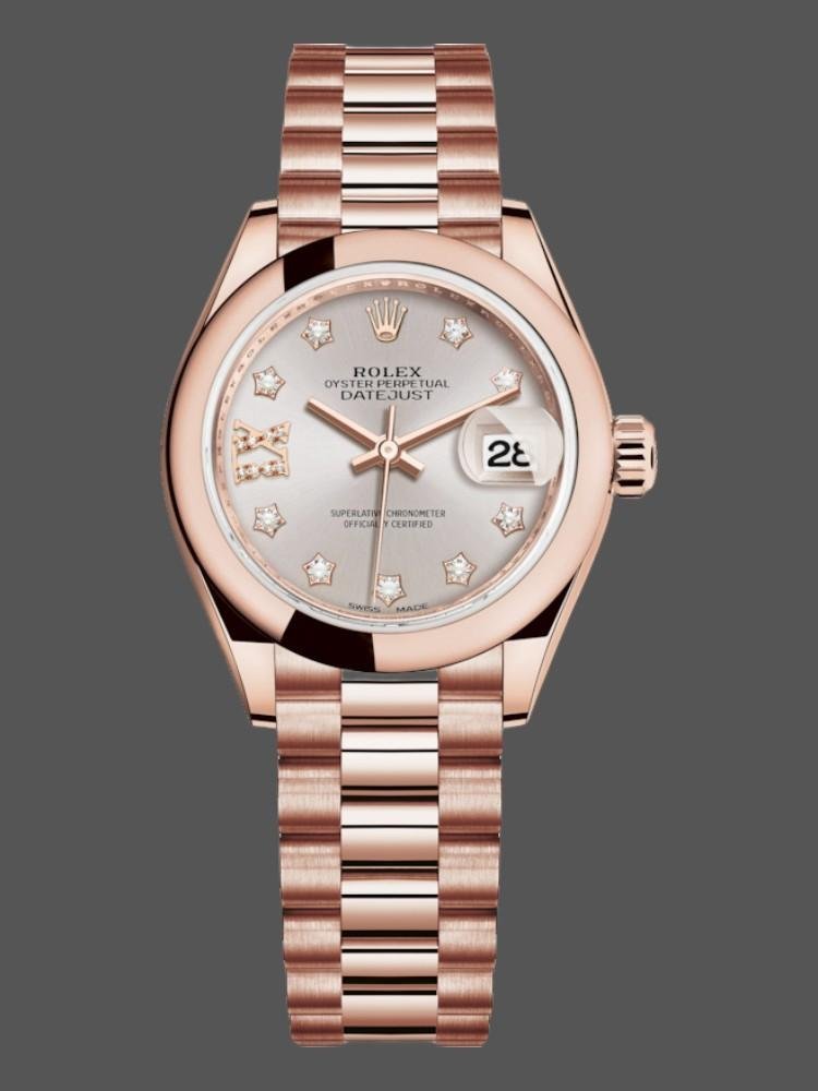 Rolex Datejust 279165 replica watch for women, Sundust dial with domed bezel and diamonds, 28 mm. 28mm Everose gold case and smooth domed bi-directional rotating bezel also in Everose gold. Scratch resistant sapphire crystal with Cyclops magnifying glass. Sundust dial with 9 diamonds set on star-shaped hour markers and 8 diamonds set on the Roman numeral IX. Calendar with date on the window at 3. Rose gold presidential bracelet with hidden clasp.