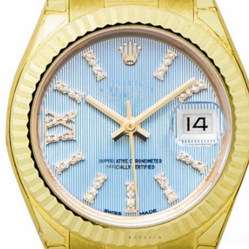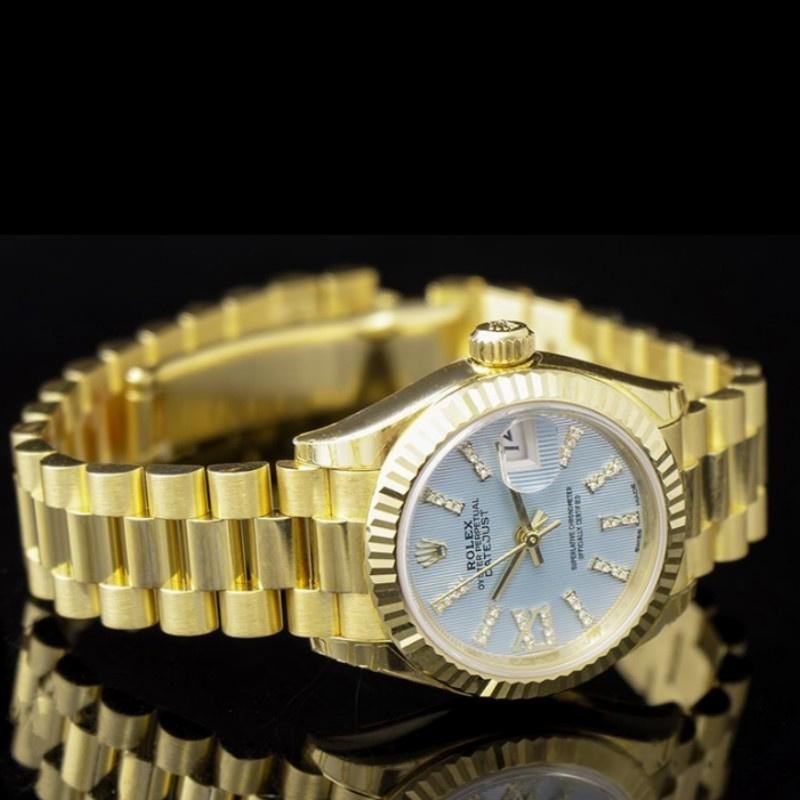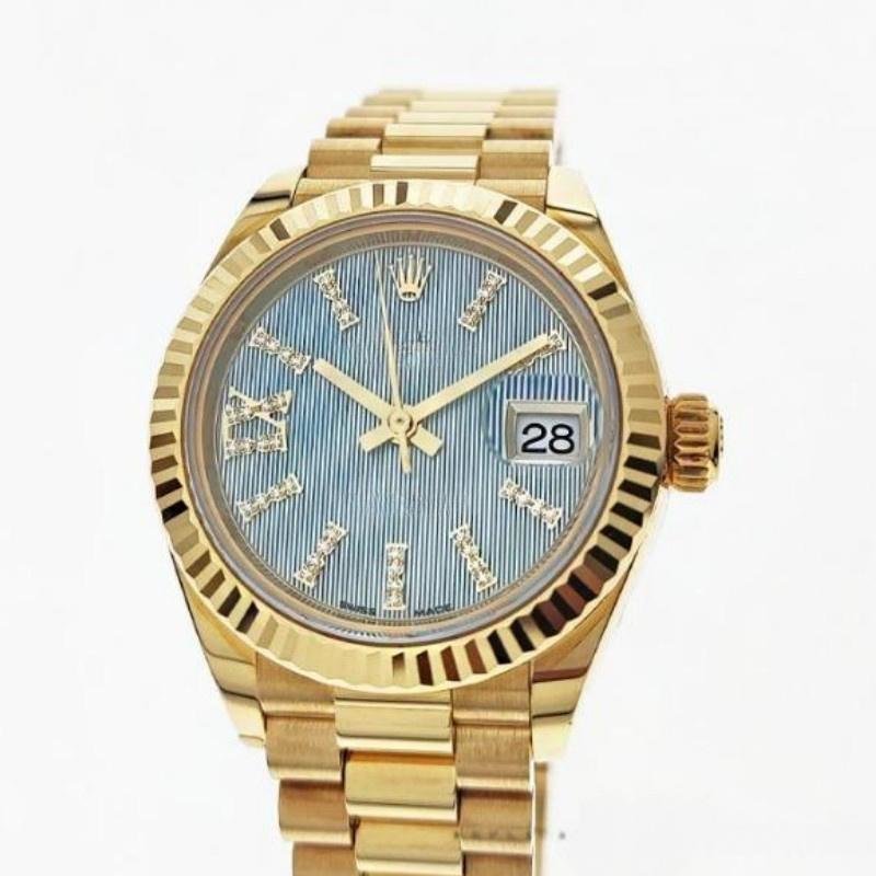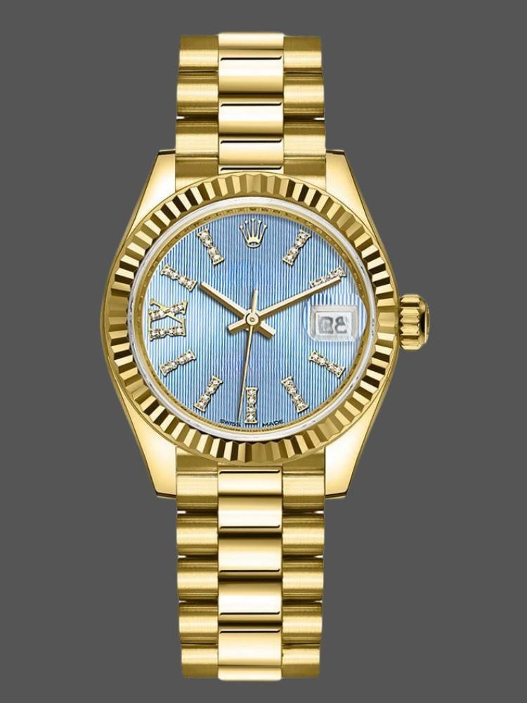 Rolex Datejust 279178 women’s watch, with cornflower blue dial and fluted bezel, 28 mm, 28 mm round yellow gold case, screw-down crown and fluted bezel yellow gold. Lilac dial with diamond indexes. Roman numeral IX with diamonds at 9. Yellow gold President bracelet with three-piece semicircular links and hidden Crownclasp folding clasp.