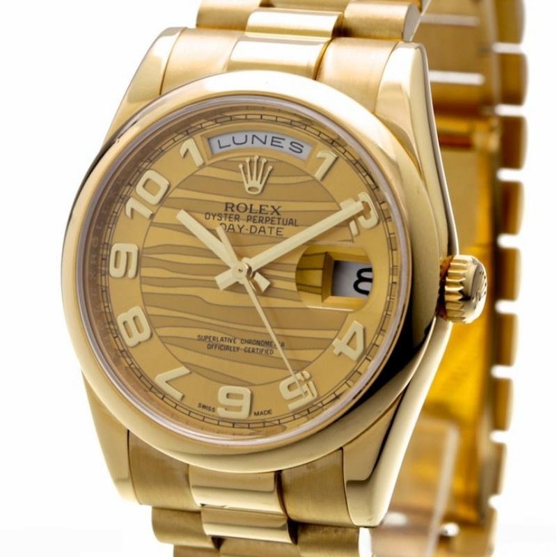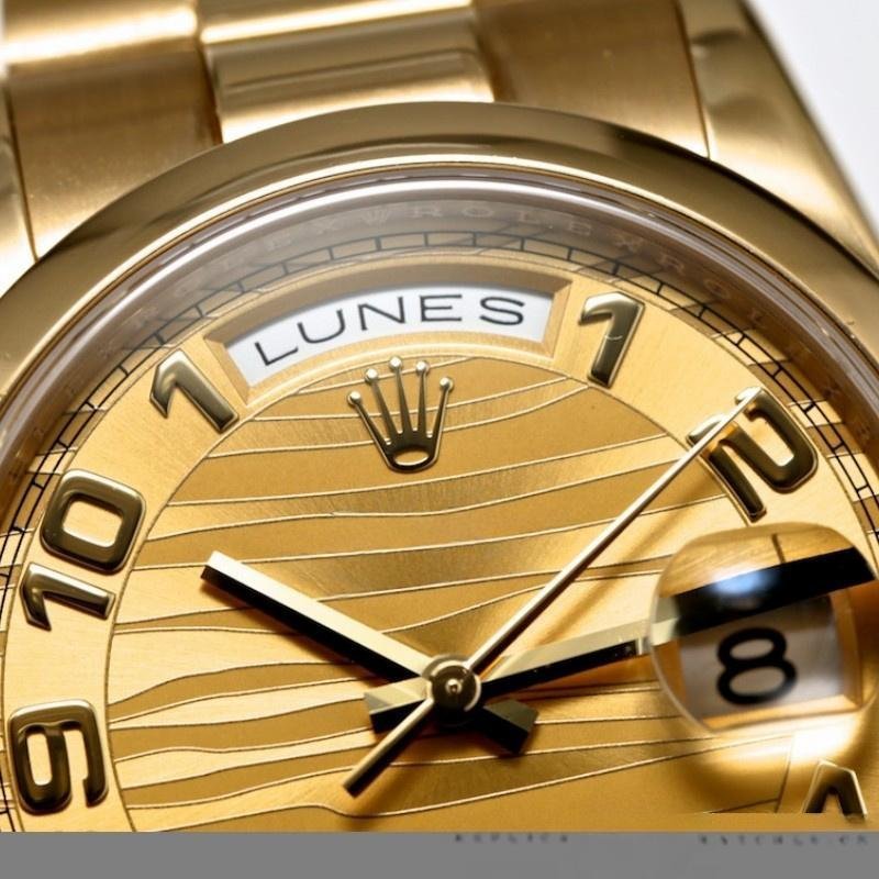 Unisex Rolex Day-Date 118208 replica watch with Arabic numerals, champagne dial and 36mm champagne dial. 36mm yellow gold case with yellow gold President bracelet. Fixed yellow gold domed bezel. Champagne dial with wavy Arabic numerals, days in Spanish instead of twelve. Date at 3. Polished bezel and yellow gold President bracelet. Scratch resistant sapphire crystal. Screw-down crown. Solid caseback.