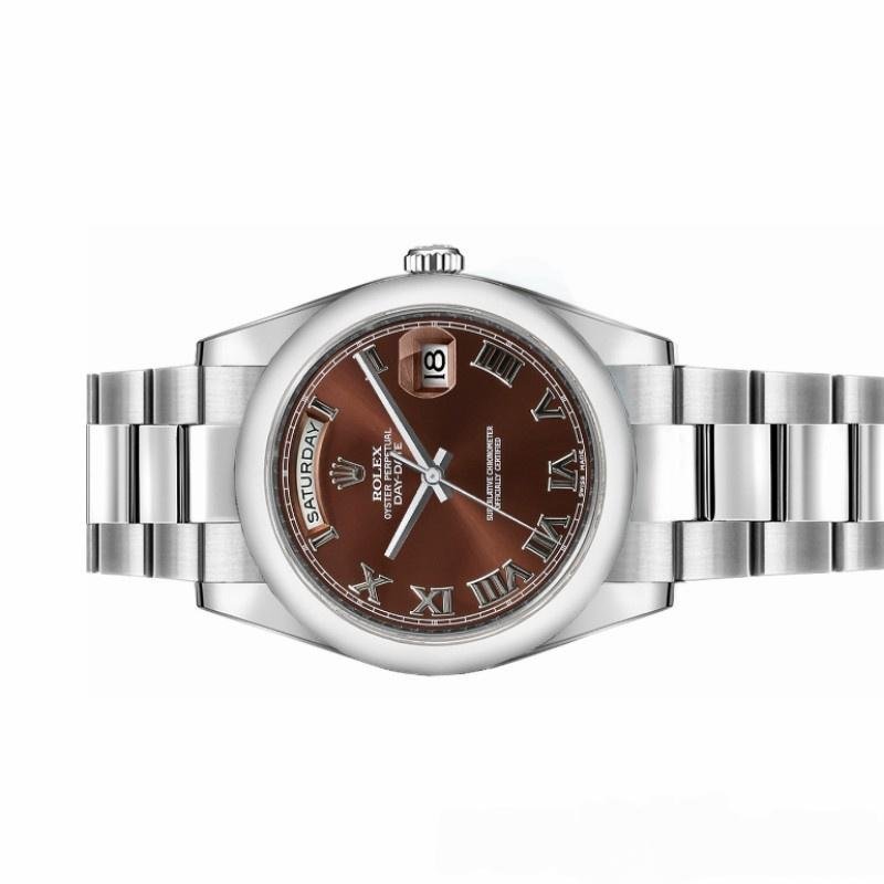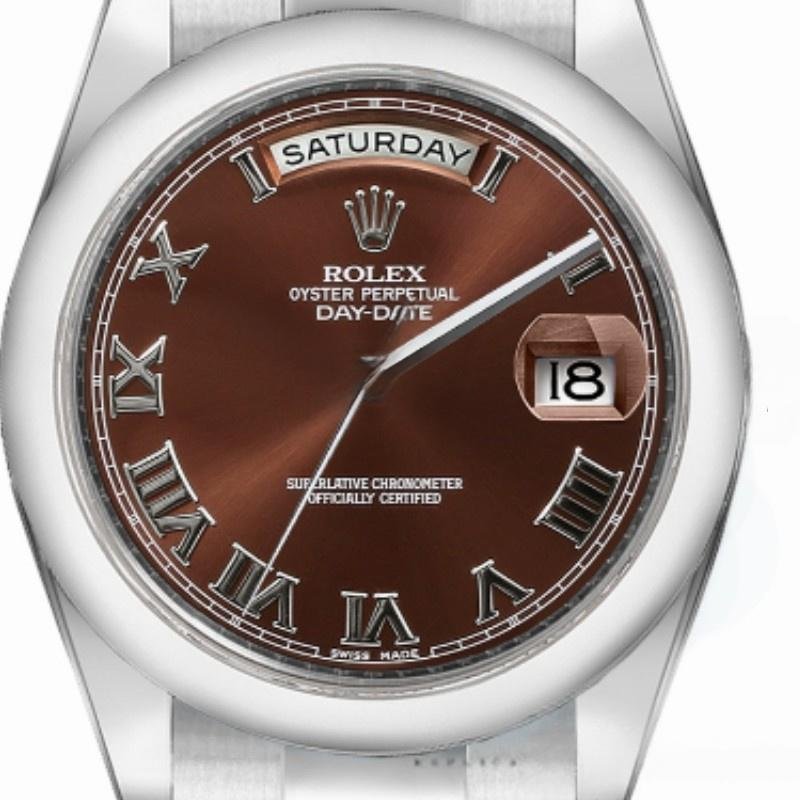 Rolex Day-Date 118209 Unisex Replica Watch with 36mm Chocolate Brown Diamond Dial. 36mm white gold case. Chocolate brown dial with Roman numerals, manufacturer’s serial numbers and minute markers on the outer edge. Date display at 3. Polished bezel, white gold domed bezel and Oyster bracelet. Scratch-resistant sapphire crystal.