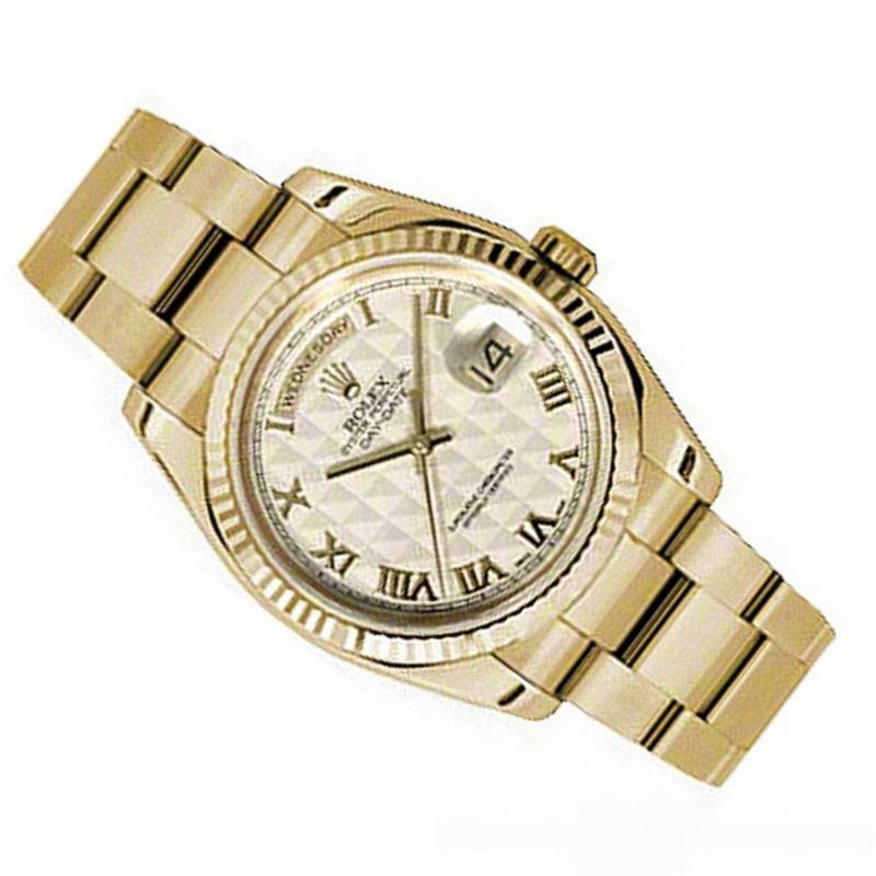 The Rolex Day-Date 118238, 36mm unisex replica with ivory pyramidal dial and Roman numerals, it features a 36mm round yellow gold case, screw-down crown and yellow gold ribbed bezel. Ivory pyramidal dial with Roman numerals, manufacturer’s serial numbers and day and date indicator at 12 and 3 o’clock. Scratch resistant sapphire crystal. Screw-down crown. The reliable yellow gold Oyster bracelet will look great on your wrist.