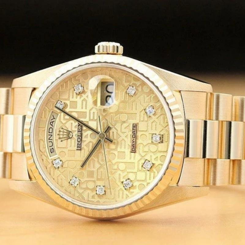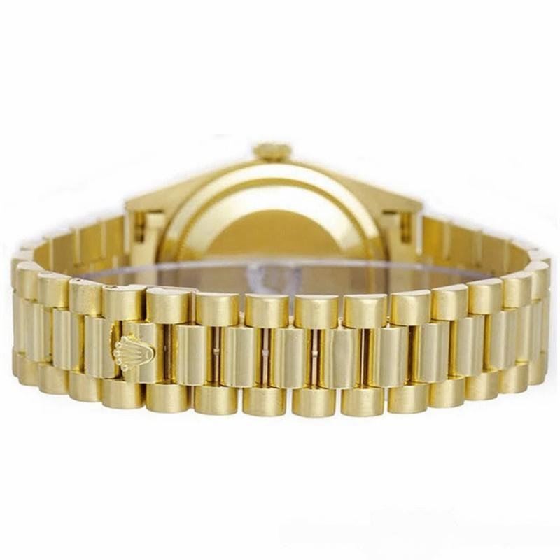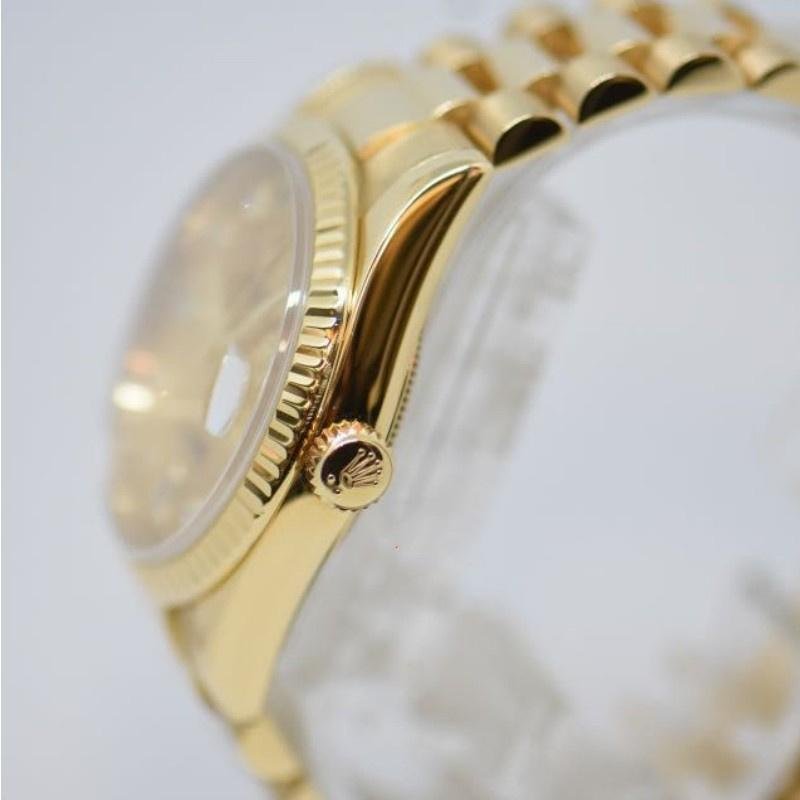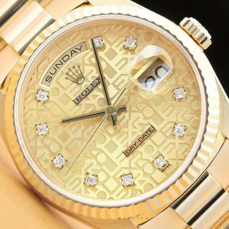 The Rolex Day-Date 118238, Champagne Jubilee yellow gold unisex watch with diamond dial and 36 mm, it is a replica that features a 36mm round yellow gold case, screw-down crown and fluted yellow gold bezel. Jubilee Champagne dial with diamonds, quarter-hour indexes with baguette-cut diamonds, date at 3 o’clock; day at 12 noon. Scratch resistant sapphire crystal. Screw-down crown. Solid caseback. The reliable yellow gold Oyster bracelet will look great on your wrist.