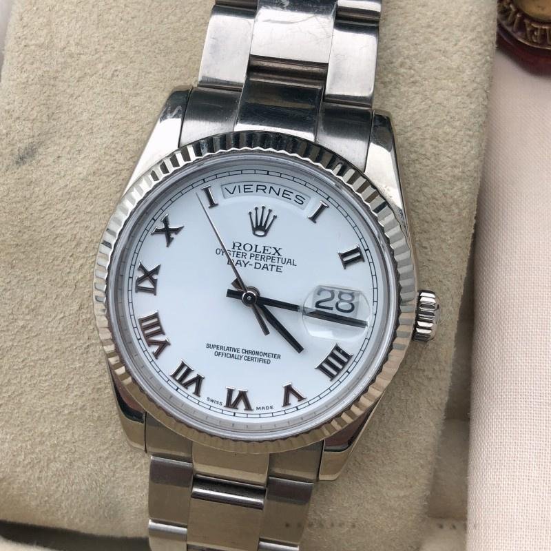 Rolex Day-Date 118239 replica, white gold, white dial with Roman numerals, 36 mm, unisex