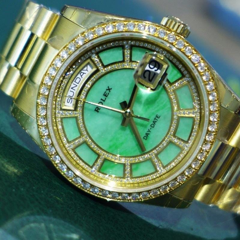 Rolex Day Date 118348, green dial, yellow gold, 36 mm, unisex. 36mm yellow gold round case with screw-down crown and diamond bezel. Jade green dial with carousel and diamonds set. Golden cane needles with central seconds hand. Day of the week window at 12. Date window at 3 o’clock with cyclops magnifying glass. The dial is surrounded by a round bezel set with brilliant-cut diamonds. The elegant hidden folding crown closure will look perfect on your wrist.
