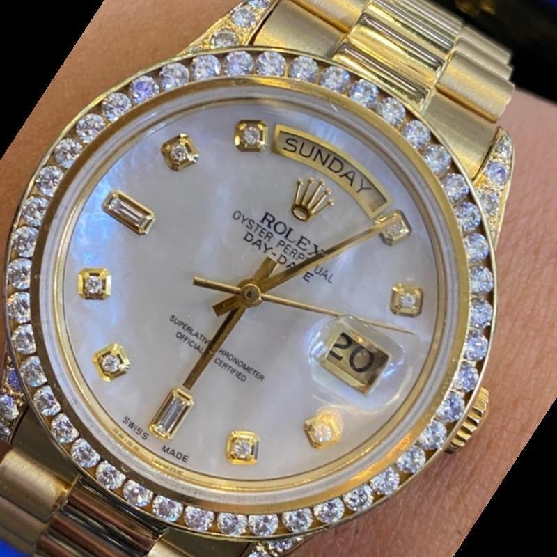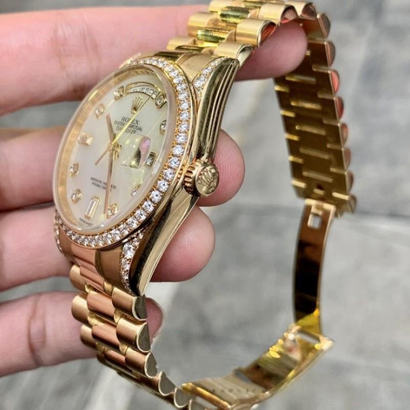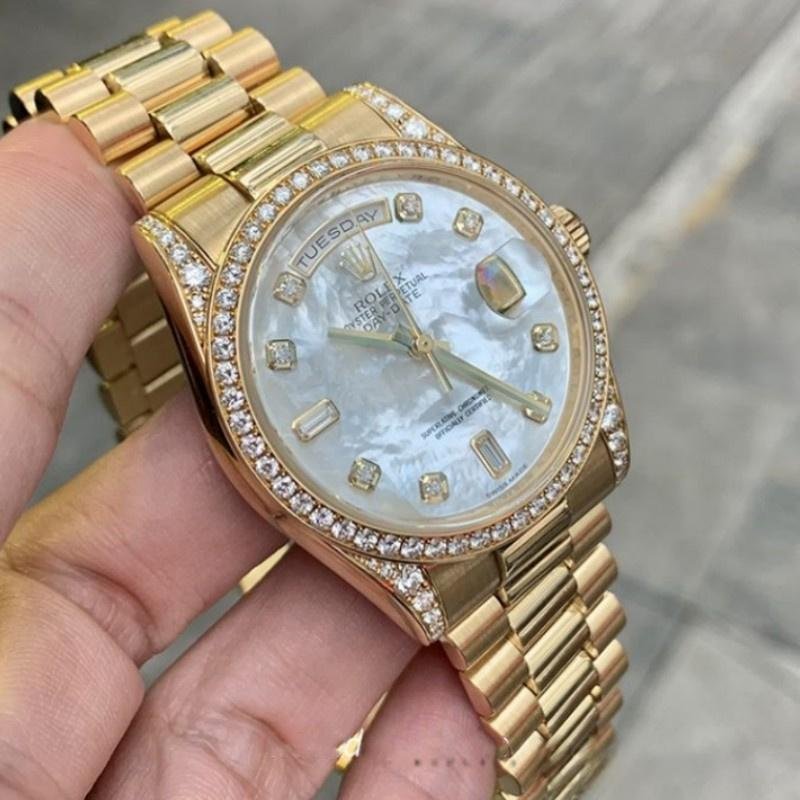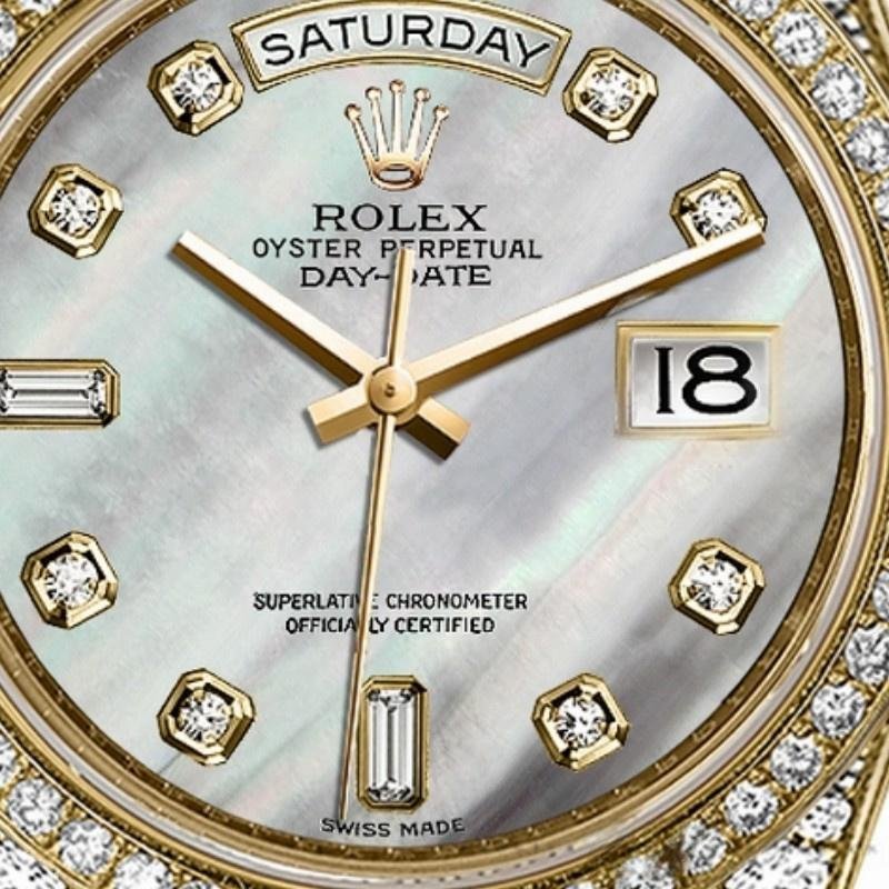 The Rolex Day-Date 118388, 36mm unisex replica with white mother-of-pearl dial and diamonds, features a 36mm yellow gold diamond case, mother-of-pearl dial with diamond yellow gold hands and hour markers, diamond-encrusted handles, matching diamond bezel, hour and minute hands, and sapphire crystal Scratch resistant with Cyclops magnifying glass. Day of the week window at 12. Date window at 3. Its elegant design with hidden folding crown closure will give a touch of class to your wrist.