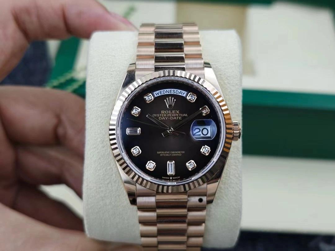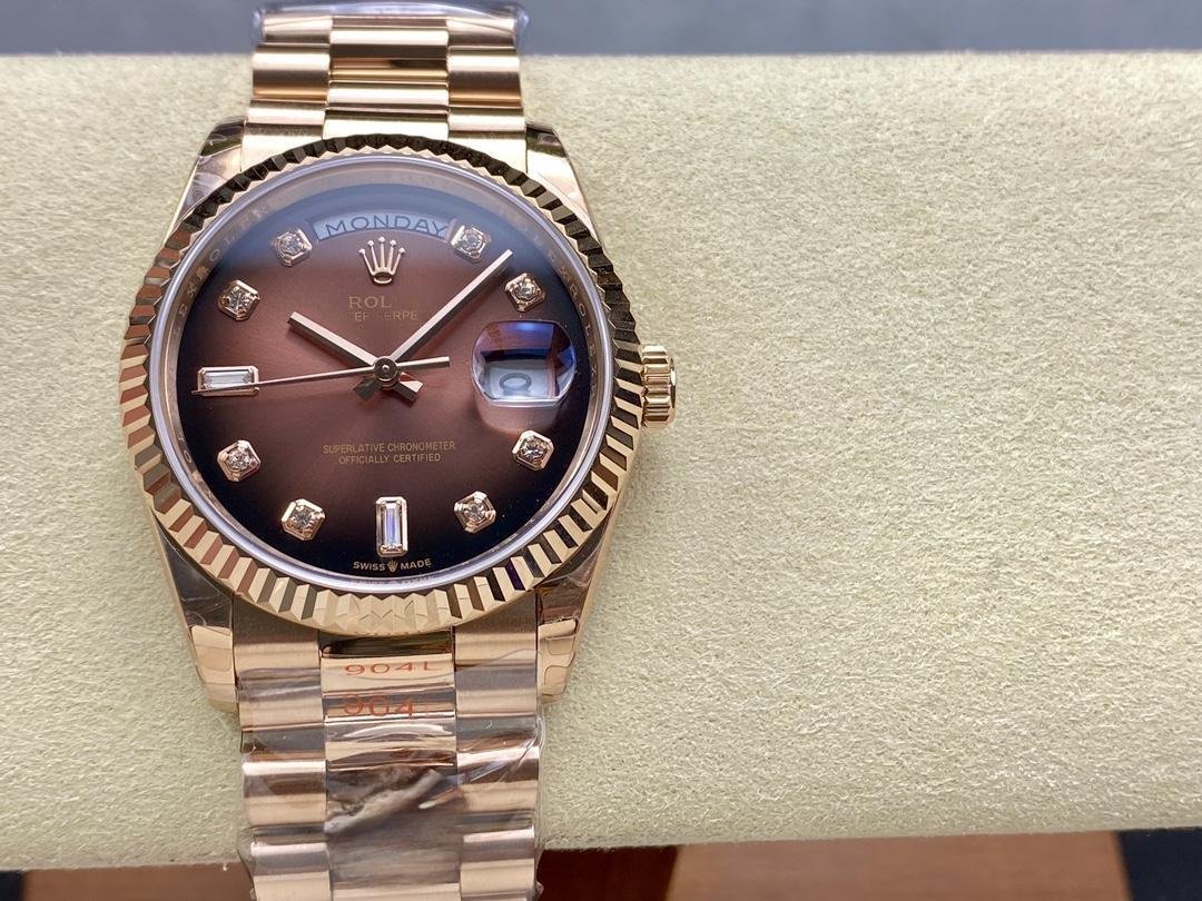 Rolex Day-Date 128235 Everose Gold Brown Ombre Diamond Dial 36MM Unisex Replica Watch, 36mm Everose Gold Case, Screwed Bottom, Twinlock Double Tightness Screwed Crown, Fluted Bezel, Scratch Resistant Sapphire Crystal with Cyclops lens on the date, ombre brown. Dial, diamond hour markers, Everose gold President bracelet with three-piece semicircular links and hidden Crownclasp folding clasp.