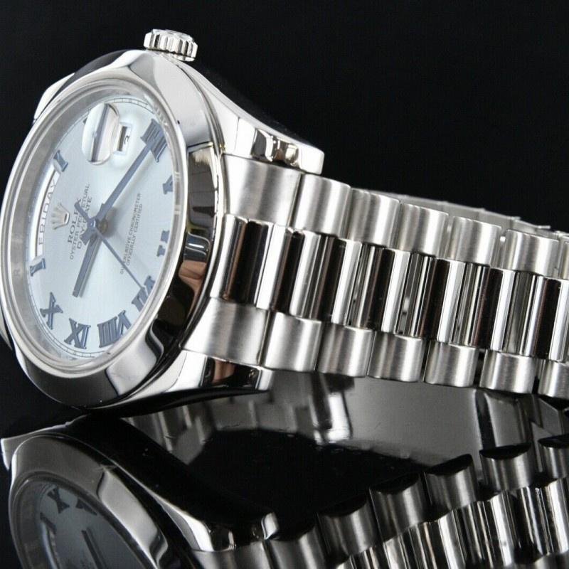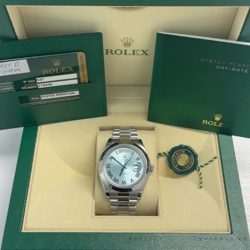 Rolex Day-Date 218206 Men’s Watch, Platinum Replica, Ice Blue Dial, 41mm. It features a 41mm round platinum case with screw-down crown and platinum bezel. Scratch resistant sapphire crystal with Cyclops magnifying glass. Ice blue dial with Roman numeral hour markers. Date window at 3 and day window at 12. The platinum President bracelet will look great on you.