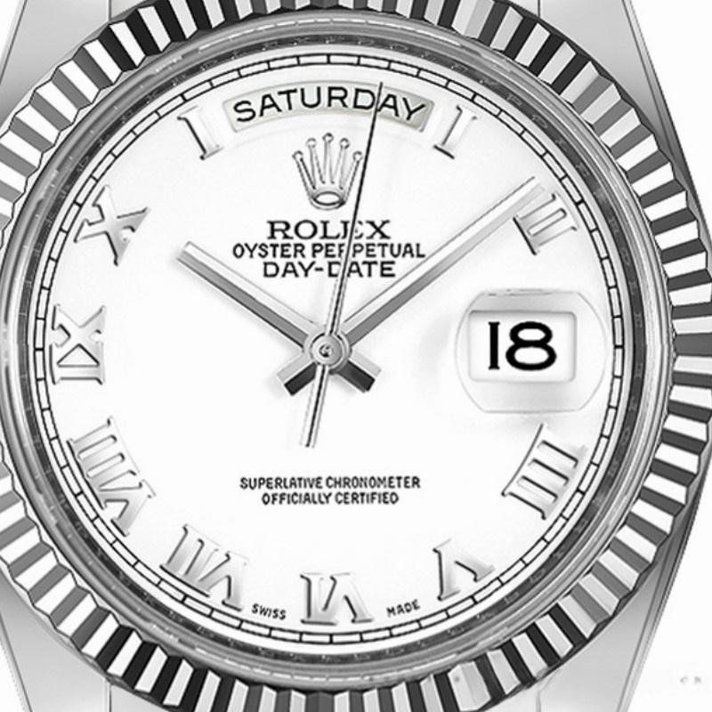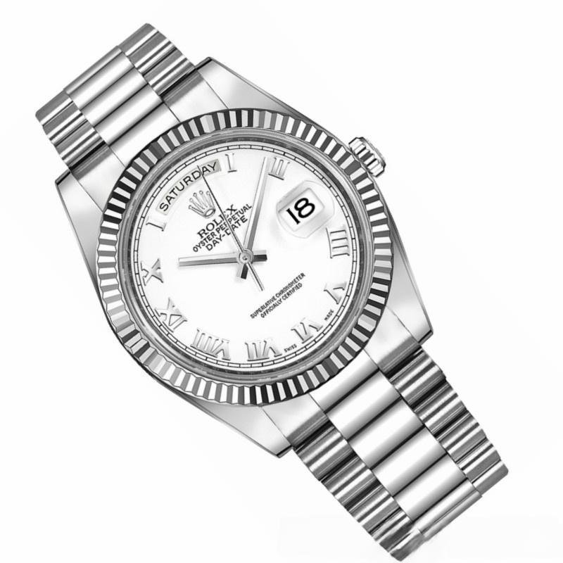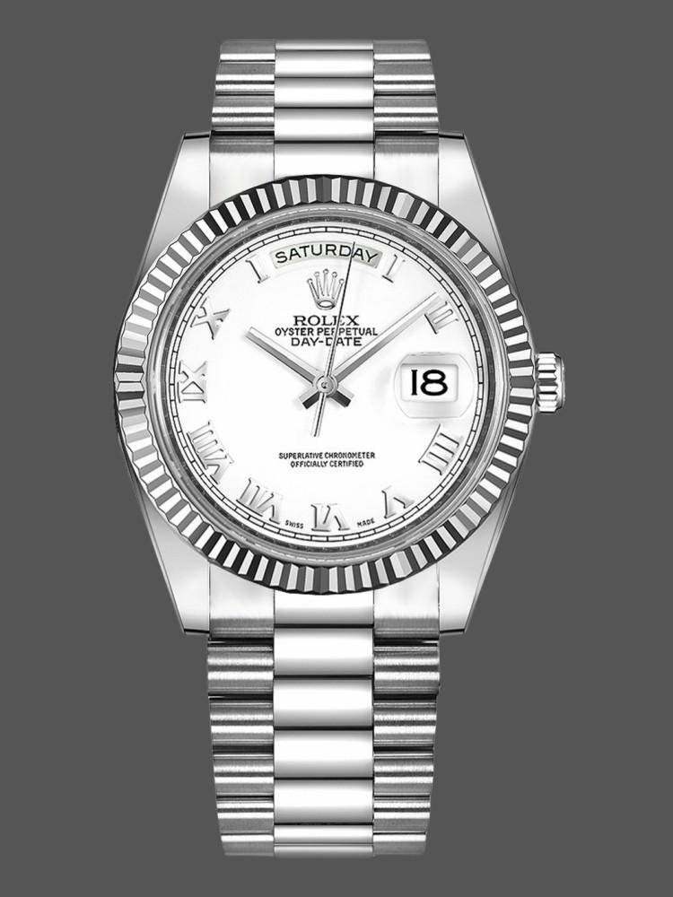 Rolex Day-Date 218239 men’s watch, replica in 41 mm white gold with white dial and Roman numerals. 41mm white gold case with solid bottom, screw-down crown and white gold fluted bezel. Scratch resistant sapphire crystal with Cyclops magnifying glass. White dial with Roman numeral time markers, date window at 3 o’clock and day window at 12 o’clock. Three-link white gold presidential bracelet with folding clasp.