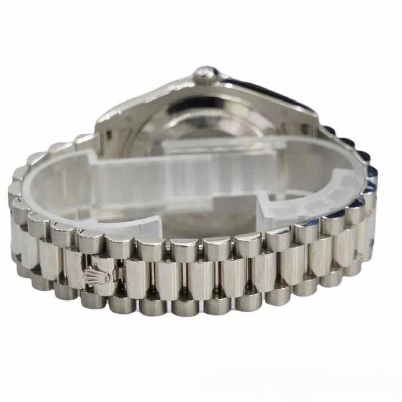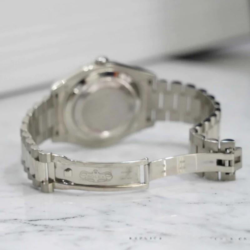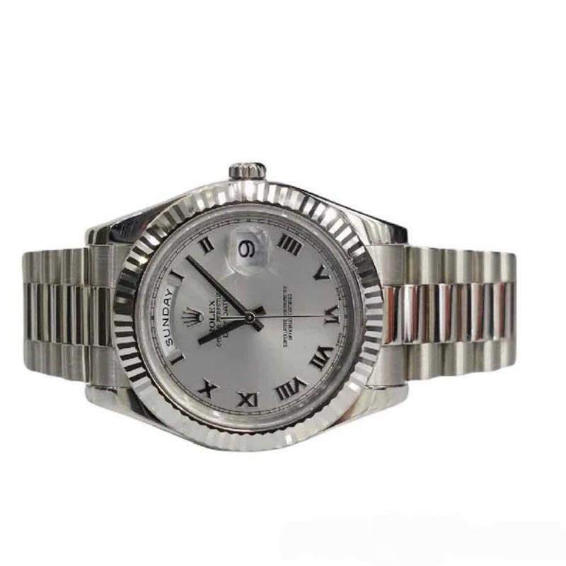 Rolex Day-Date 218239 men’s watch, white gold replica, silver dial with Roman numerals, 41 mm. 41mm white gold case with solid bottom, screw-down crown and white gold fluted bezel. Scratch resistant sapphire crystal with Cyclops magnifying glass. Silver dial with Roman numeral time markers, date window at 3 o’clock and day window at 12 o’clock. Three-link white gold presidential bracelet with folding clasp.