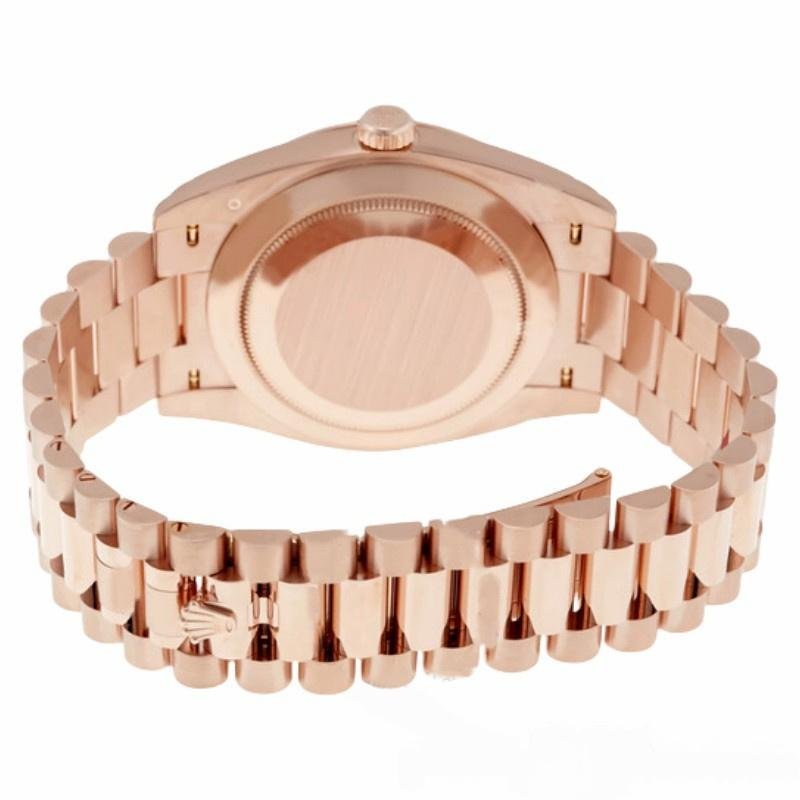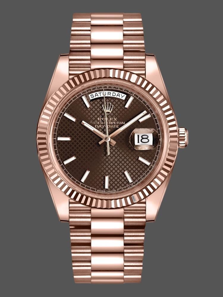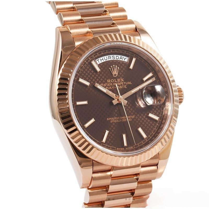 Rolex Day-Date 228235 chocolate brown watch with dial with diagonal motif and 40 mm knurled bezel for men. It features a 40mm Everose gold case, solid caseback with screw-down crown and knurled bezel. Scratch resistant sapphire crystal with Cyclops magnifying glass. Chocolate brown dial with diagonal motif and time markers, date window at 3 o’clock, day of the week window at 12 o’clock, three-piece presidential bracelet in Everose gold with folding clasp.