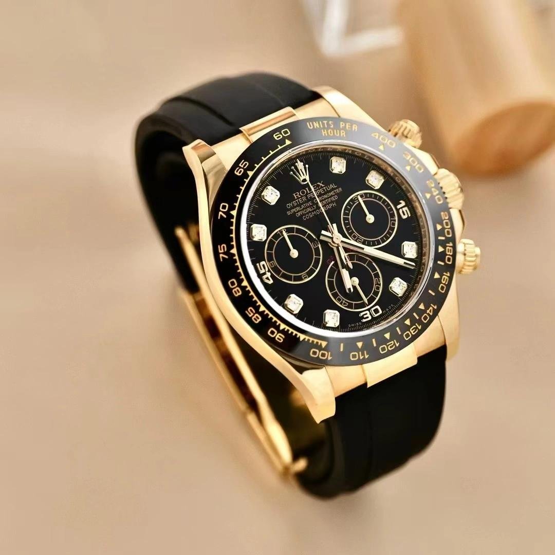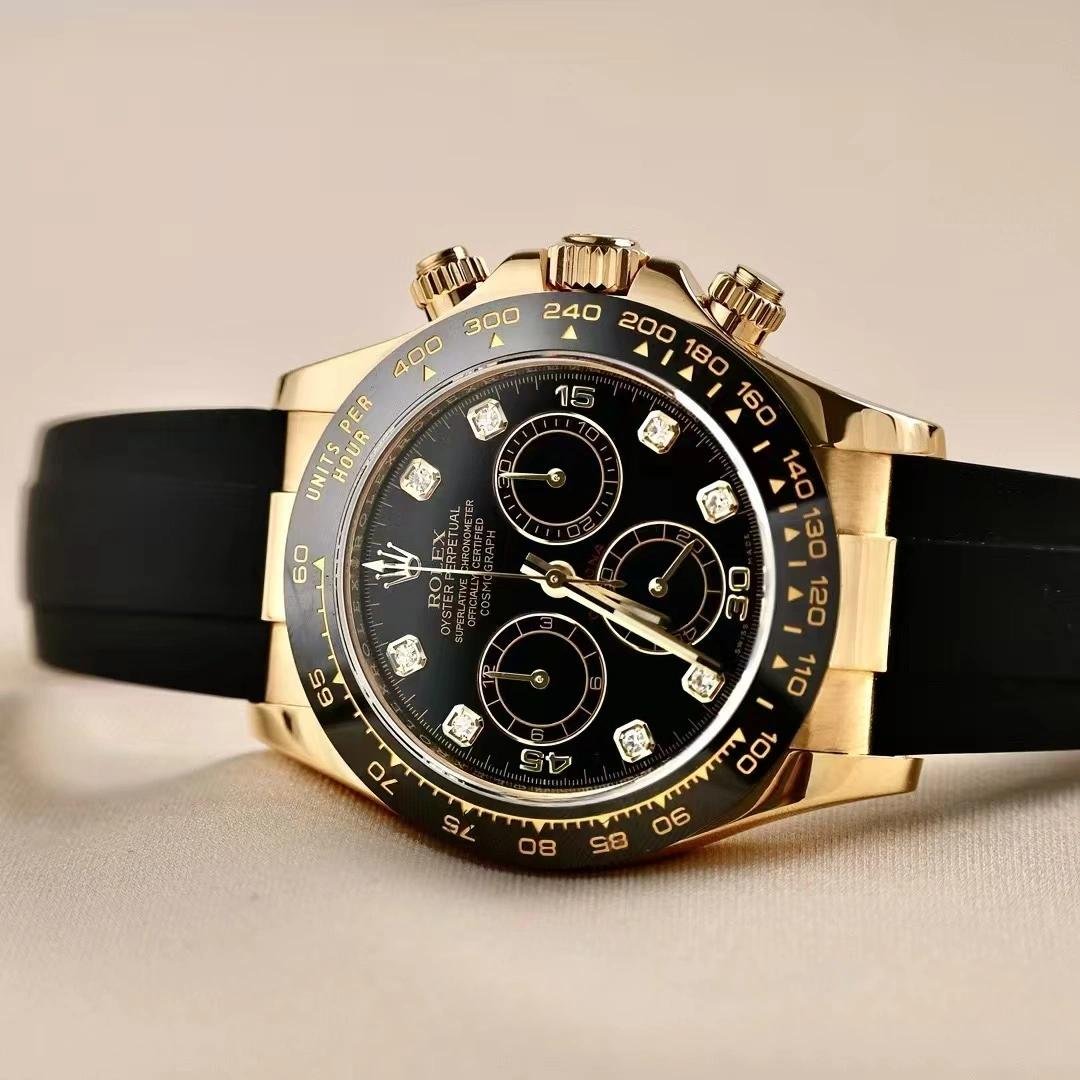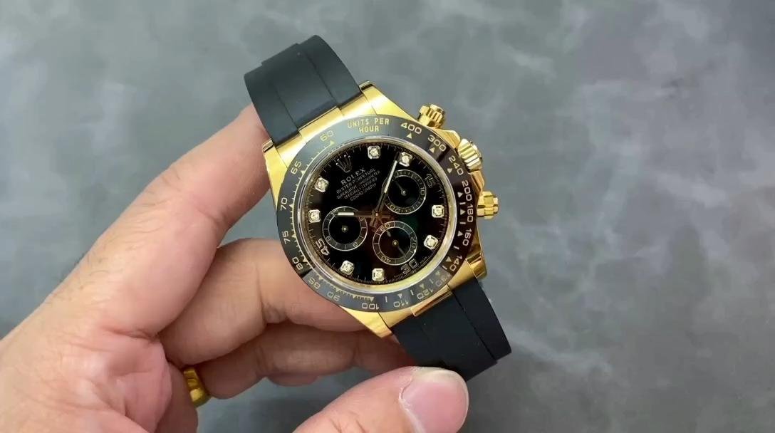 Rolex Daytona 116518LN replica watch for men, black dial with diamonds, 40 mm. 40 mm yellow gold case, yellow gold screwed back, Triplock triple-sealed screw-down crown and pushers, black monobloc Cerachrom bezel with engraved tachymeter scale, scratch-resistant sapphire crystal with double anti-reflective treatment. Black dial, 8 diamond indices, central chronograph seconds hand, 30-minute counter at 3 o’clock and 12-hour counter at 9 o’clock. Black rubber strap. Oysterlock folding safety lock.