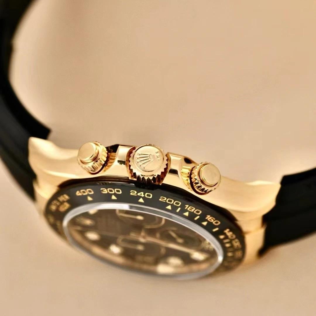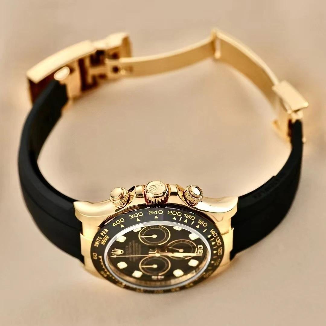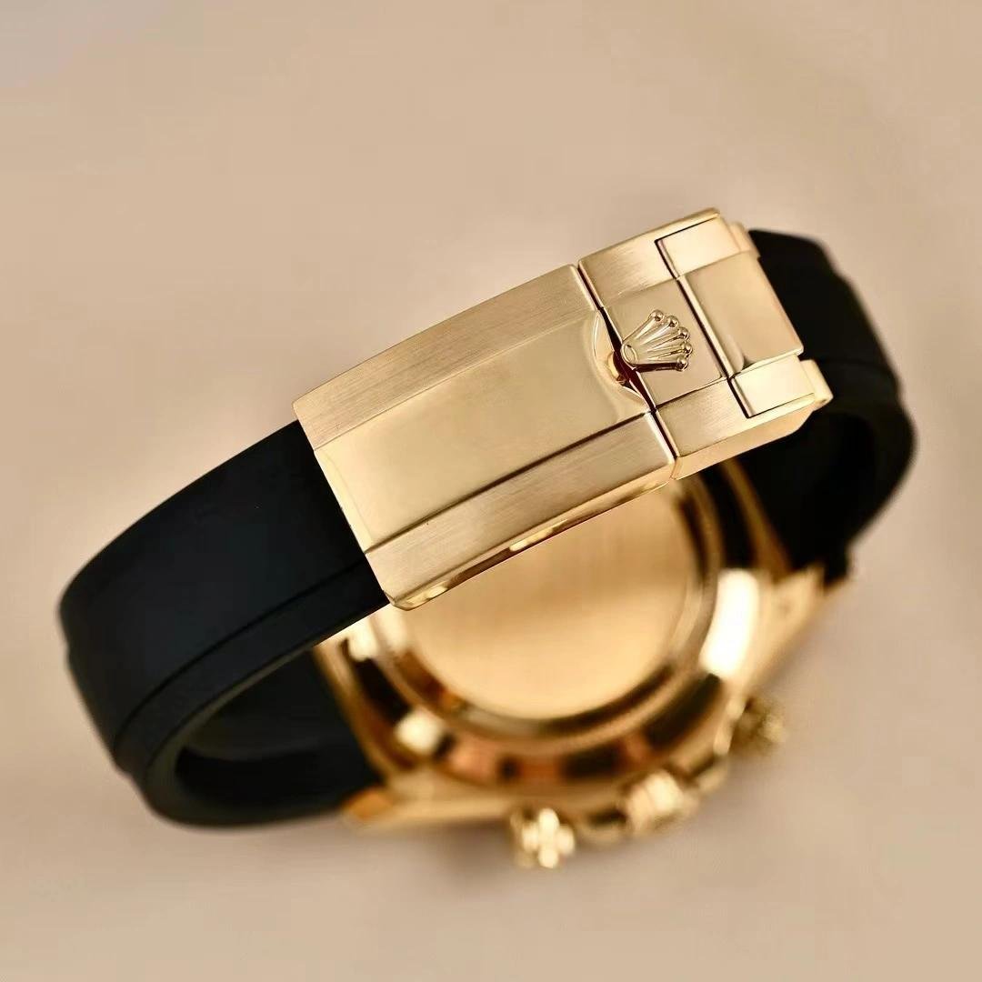 Rolex Daytona 116518LN replica watch for men, black dial with diamonds, 40 mm. 40 mm yellow gold case, yellow gold screwed back, Triplock triple-sealed screw-down crown and pushers, black monobloc Cerachrom bezel with engraved tachymeter scale, scratch-resistant sapphire crystal with double anti-reflective treatment. Black dial, 8 diamond indices, central chronograph seconds hand, 30-minute counter at 3 o’clock and 12-hour counter at 9 o’clock. Black rubber strap. Oysterlock folding safety lock.