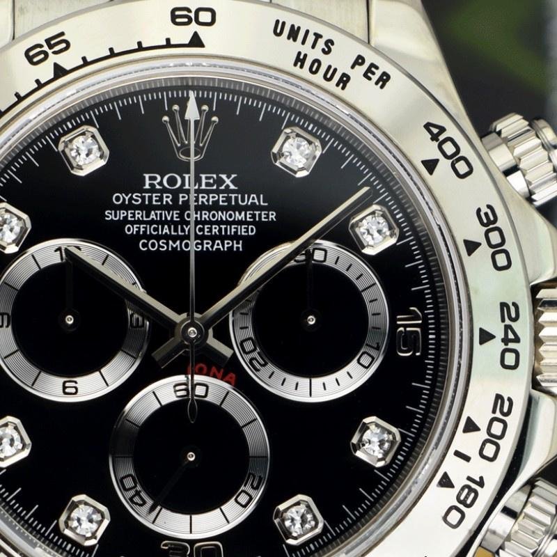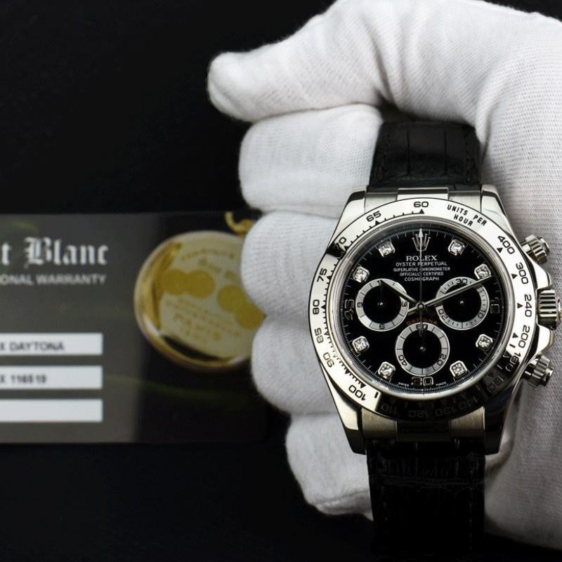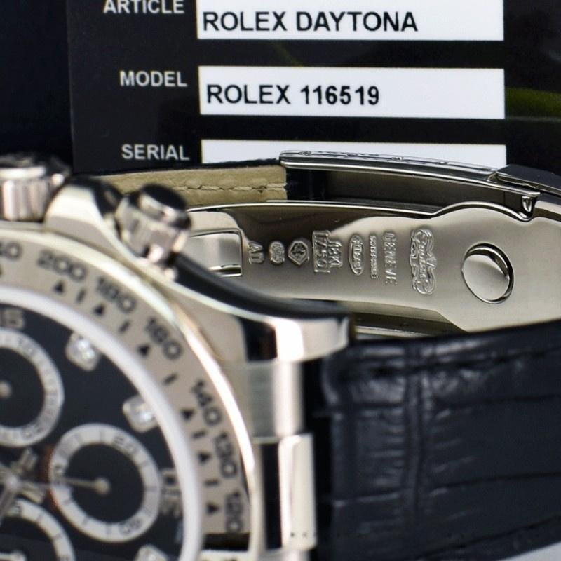 Rolex Daytona 116519 replica watch for men with black dial and 40 mm diamonds. 40mm white gold case. Black dial with silver subdials and diamond indices, chronograph, small seconds hand at 6 o’clock, luminous hands, black crocodile leather strap and white gold tachymetric bezel. Scratch resistant sapphire crystal.