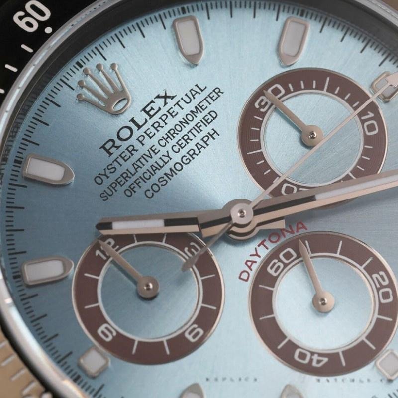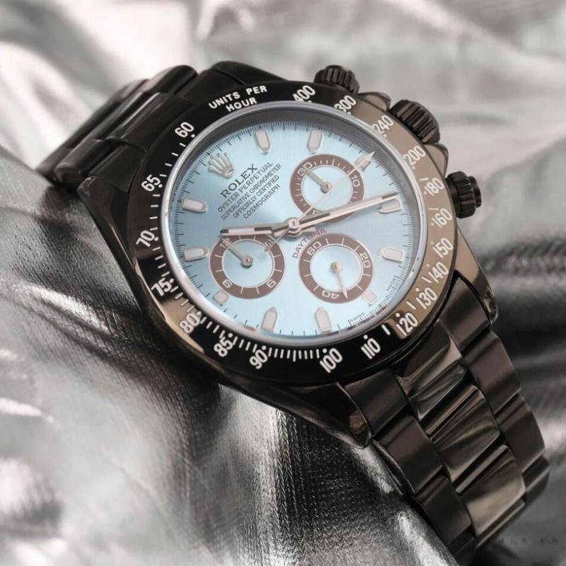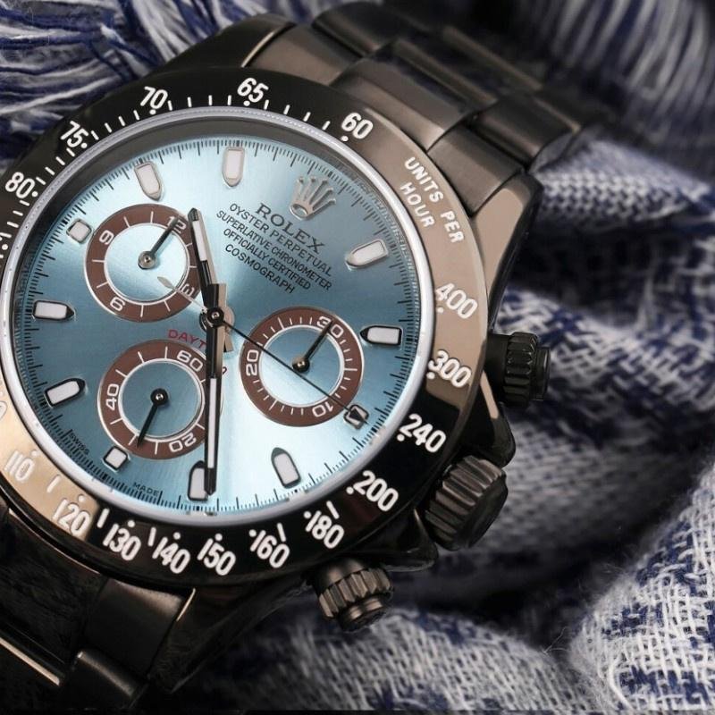 Rolex Daytona 116523 replica watch for men, stainless steel with black PVDLC coating, 40 mm. 40mm round stainless steel bezel with engraved tachymeter, ice blue dial, silver hands, screw-down crown, scratch-resistant sapphire crystal, black stainless steel Oysterlock bracelet.