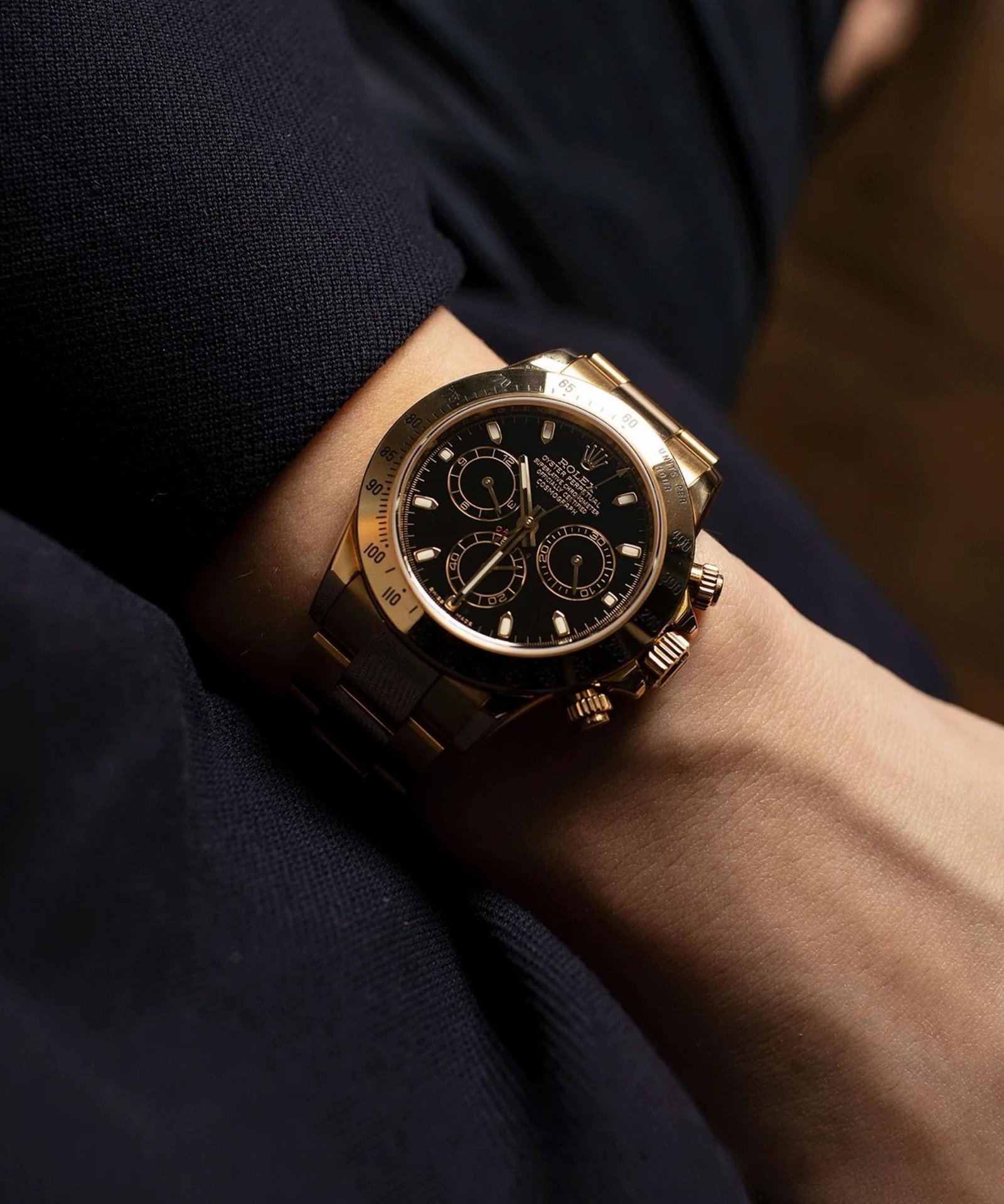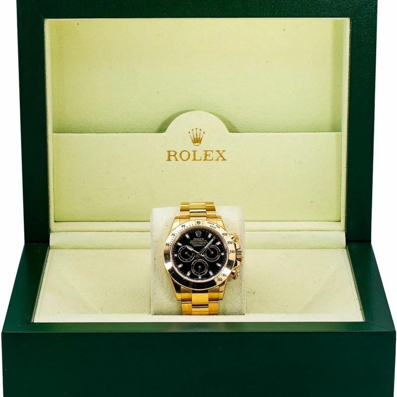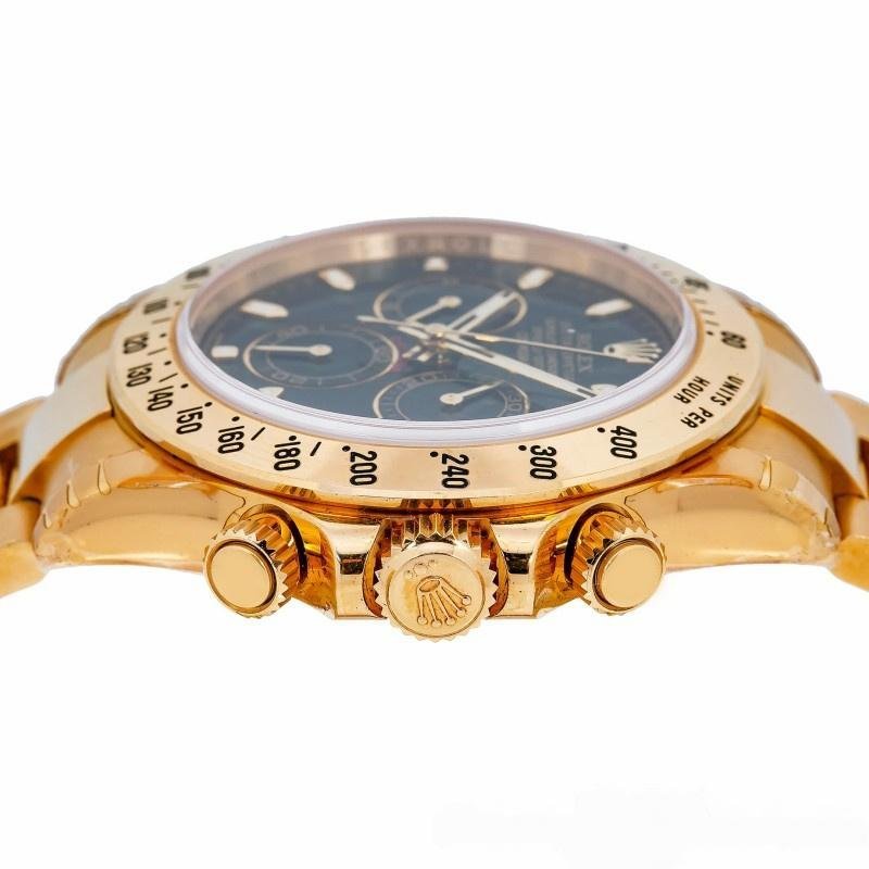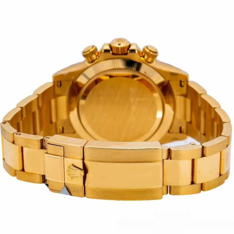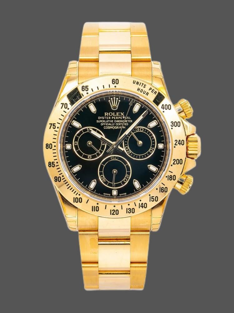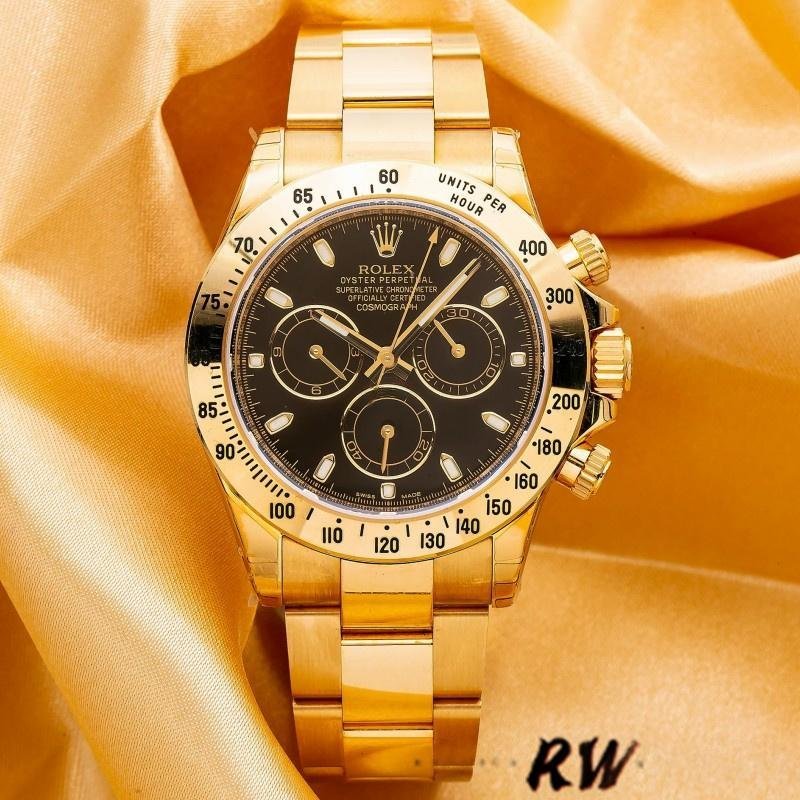 The Rolex Daytona 116528, black dial, yellow gold, 40 mm, replica of the men’s watch, it features a 40mm round yellow gold case with a screw-down crown and a yellow gold domed dial. It features a polished case and bezel. Black dial with 3 functional subdials and subdial with seconds hand at 6 o’clock. The elegant design of the Oysterlock folding safety clasp yellow gold watch will give it a flawless look.