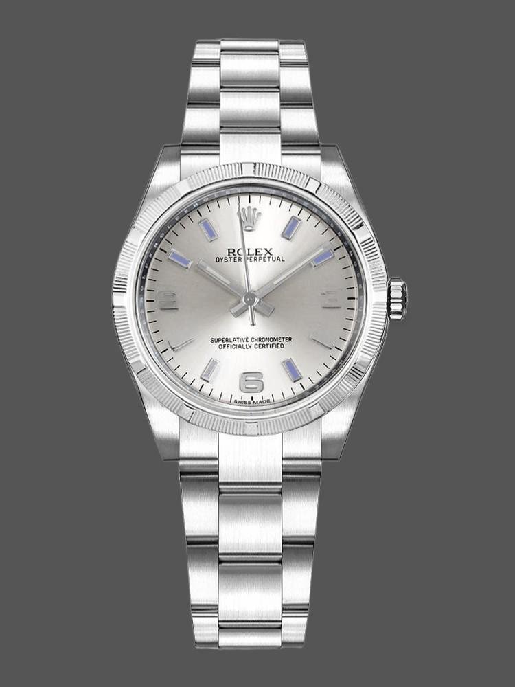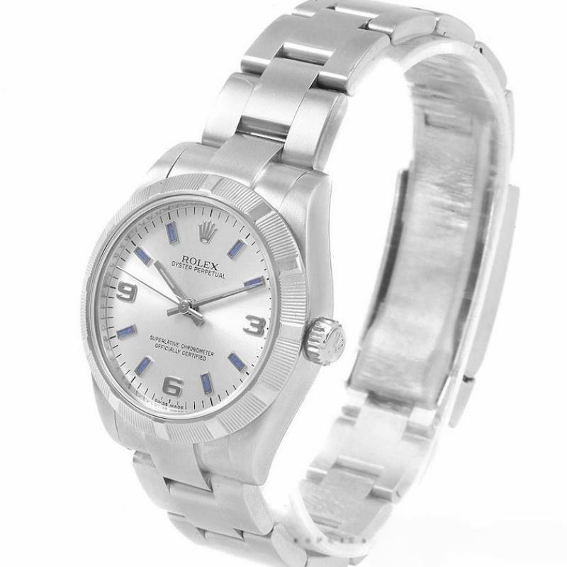 The Rolex Oyster Perpetual 177210, women’s replica, silver dial, blue hour markers, 31 mm, it features a 31mm round stainless steel case with screw-down crown and turned bezel. The silver dial, with applied blue hour markers and Arabic numerals, and the reliable stainless steel Oyster bracelet will look great on you.