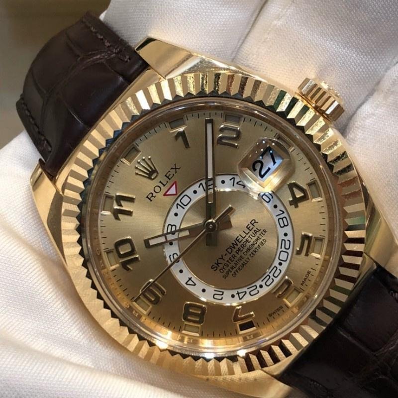 Replica Rolex Sky-Dweller 326138 Men’s Champagne Arabic Dial Yellow Gold 42mm