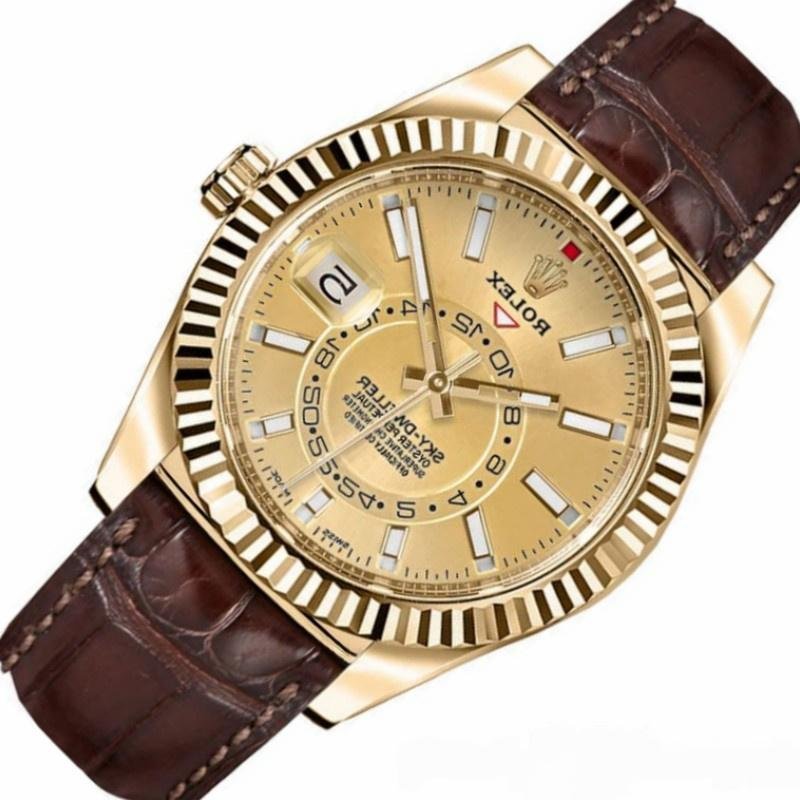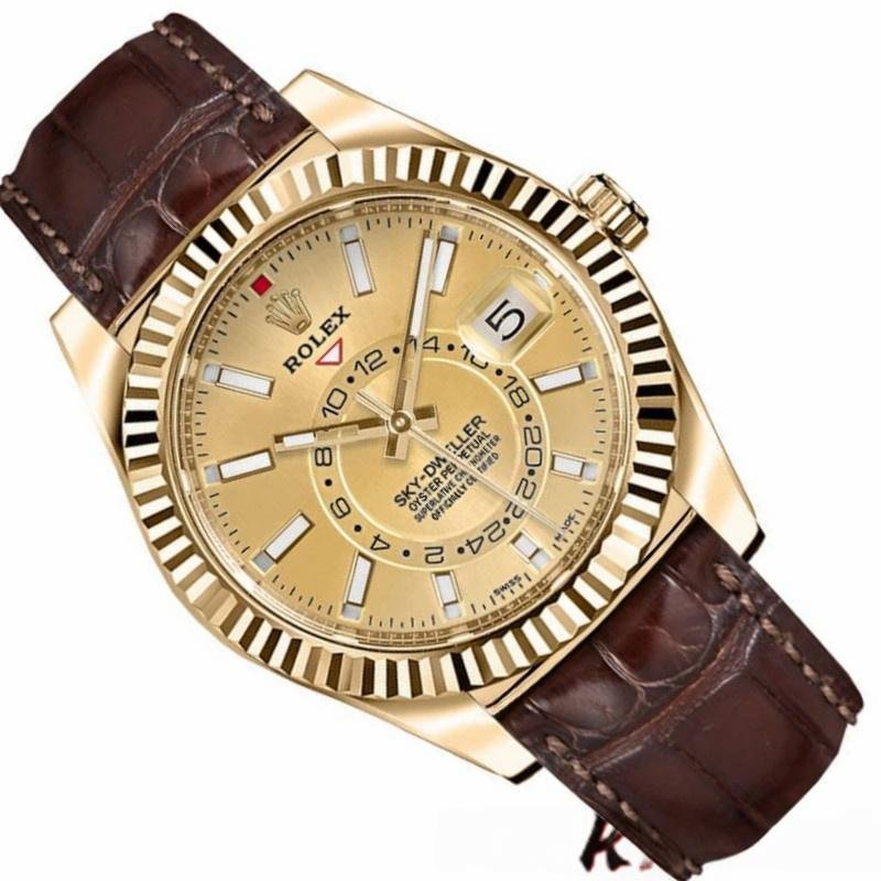 Rolex Sky-Dweller 326138 replica watch for men, champagne dial, yellow gold, 42mm. 42mm yellow gold case, fluted bezel with two-way swivel ring, champagne dial with yellow gold hands and indexes. Second time zone shown by an off-center rotating disk. Saros annual calendar dated at 3 a.m. and month indicated in discreet windows at each of the 12 p.m. Alligator leather strap with yellow gold folding Oysterclasp closure.