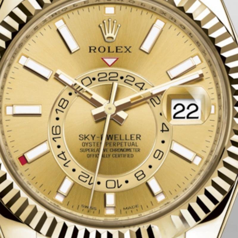 Replica Rolex Sky-Dweller 326138 for men, champagne dial, yellow gold, 42 mm