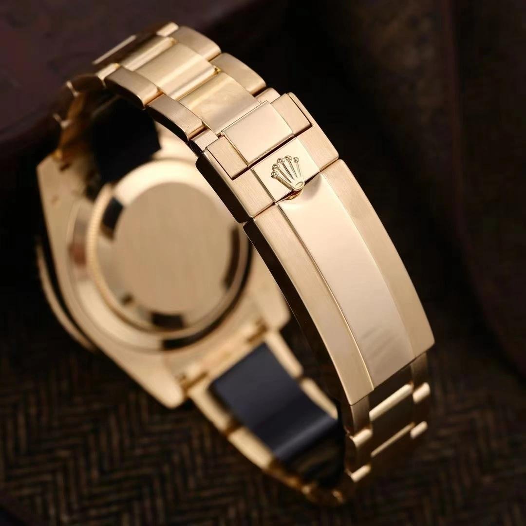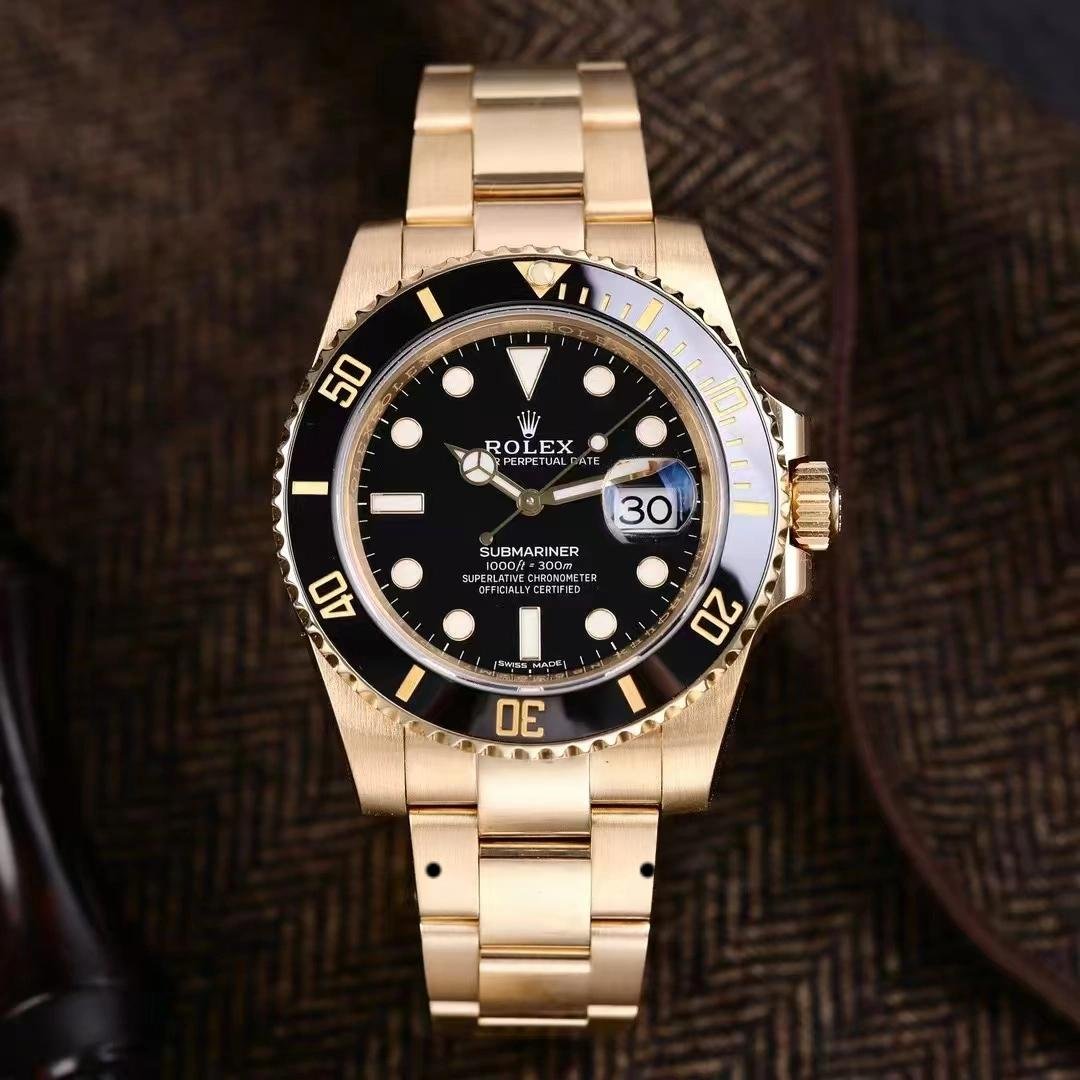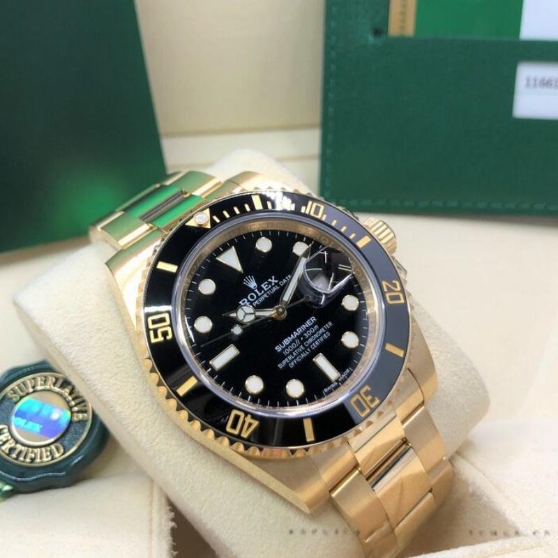 The Rolex Submariner 116618, men’s replica, in yellow gold and black dial, 40 mm, it has a 40 mm yellow gold case, a unidirectional black ceramic bezel with a 60-minute graduation. Black dial with luminous inlaid hands and hour markers. Calendar with window at 3. Scratch resistant sapphire crystal with Cyclops lens. Yellow gold Oyster bracelet with Oysterlock clasp.