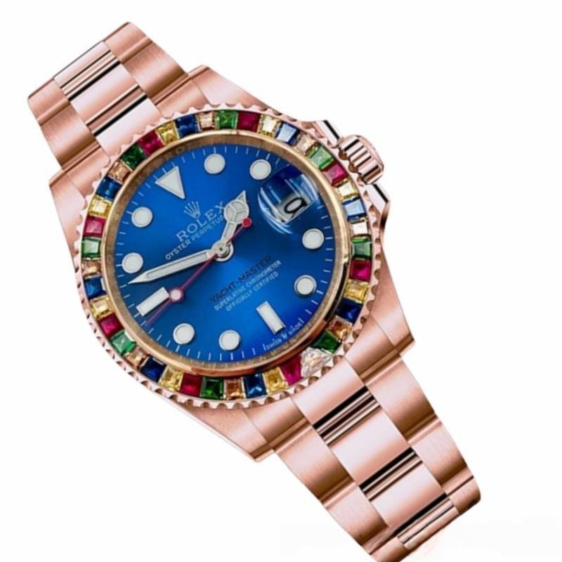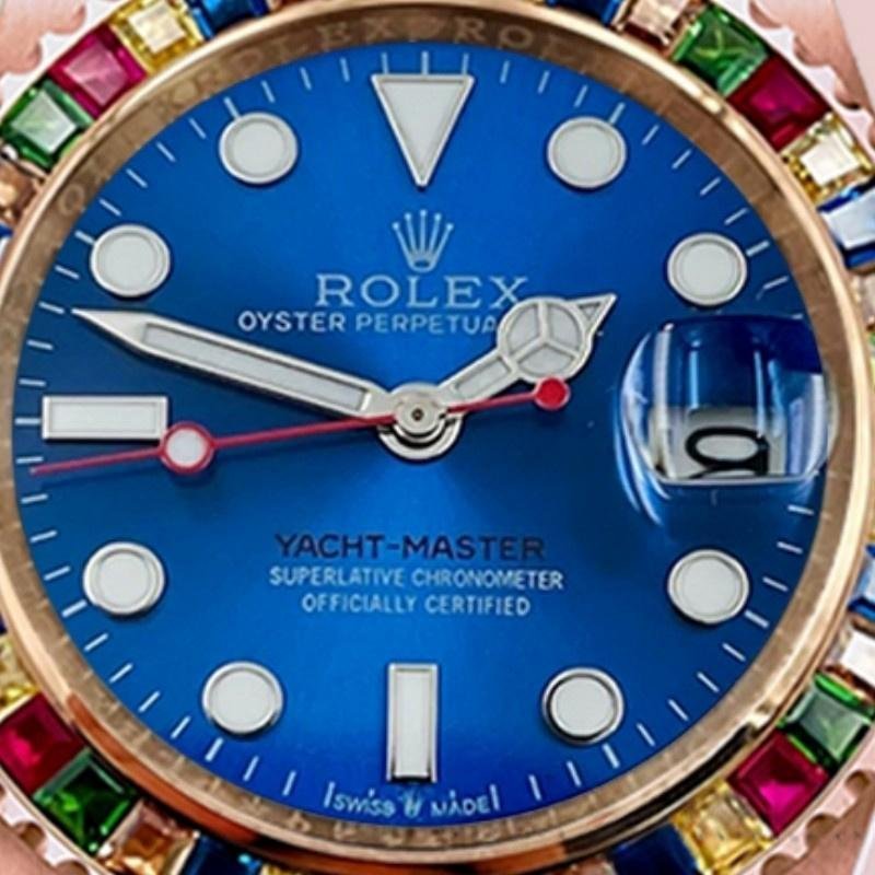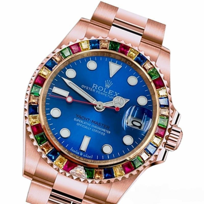 Rolex Yacht-Master 116695 Everose Gold replica watch with blue dial, 40 mm, for men. 40 mm Everose gold case and diamond bezel. The blue dial has luminescent hands and dotted hour markers. Date window under a Cyclops lens at 3 o’clock. Screwed caseback. Everose gold Oyster bracelet with safety clasp.