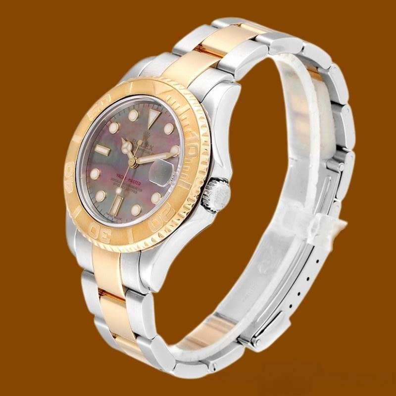 The Rolex Yacht-Master 168623, unisex steel replica, yellow gold, black mother-of-pearl dial, 35 mm, it features a 35mm round yellow gold case with screw-down crown and a 60-minute rotating yellow bezel. Black mother-of-pearl dial with dotted hour markers. Date window at 3 o’clock. The reliable Oyster bracelet in yellow gold and stainless steel will look perfect on your wrist.