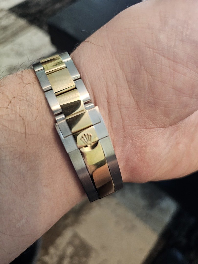 Quizás pida una correa Oysterflex auténtica, y creo que durará más y tendrá una sensación diferente. Aunque vale la pena como el reloj completo, así que es dudoso. Por lo demás, la calidad es increíble y ambos están impecables.